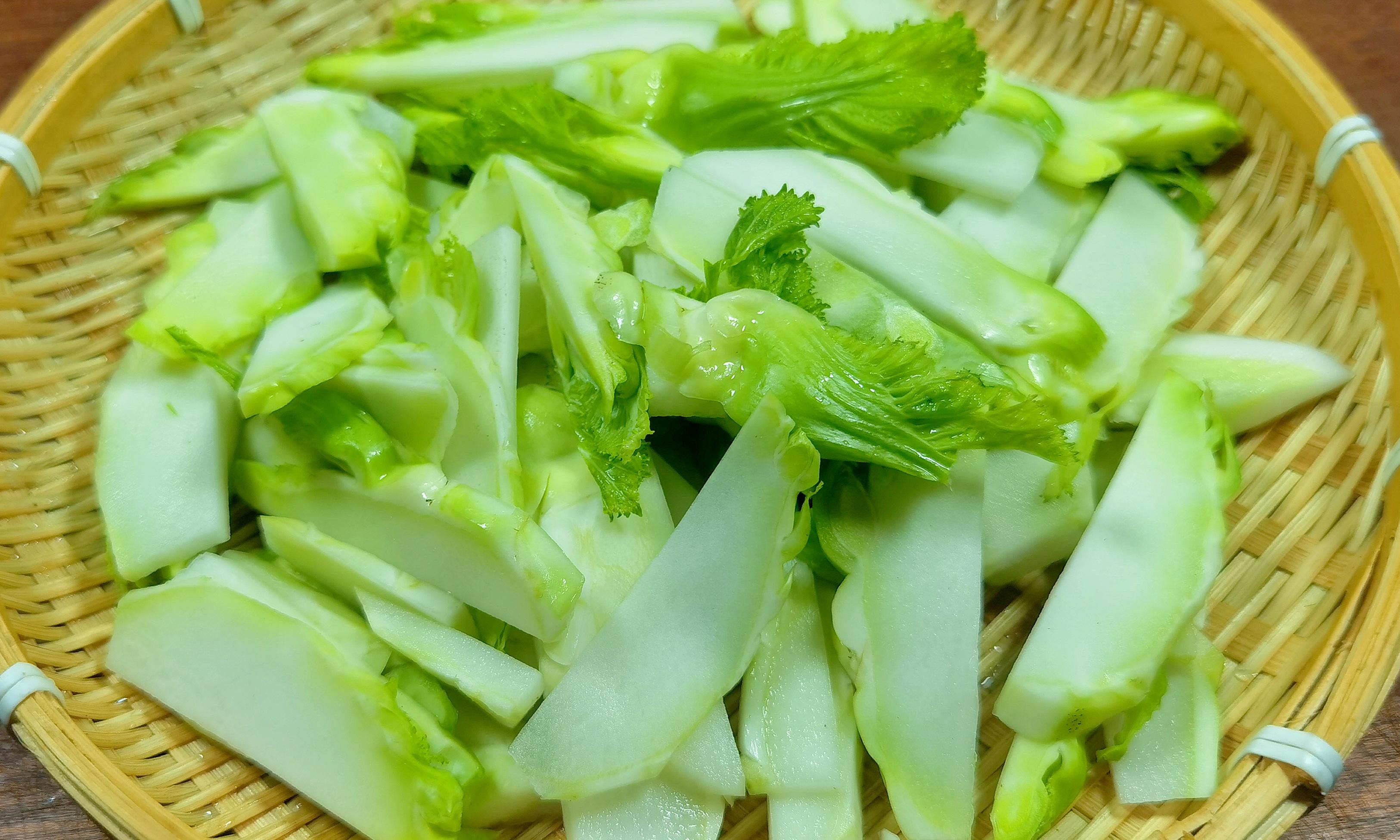 兒菜買回來,先用水沖洗乾淨。因爲它形狀特殊,縫隙裏容易藏泥,可以掰開小芽仔細沖洗。洗淨後,把兒菜切成均勻的薄片——主莖部分切厚一點也沒關係,嫩芽部分可以切薄些,這樣炒的時候熟得快,口感也一致。