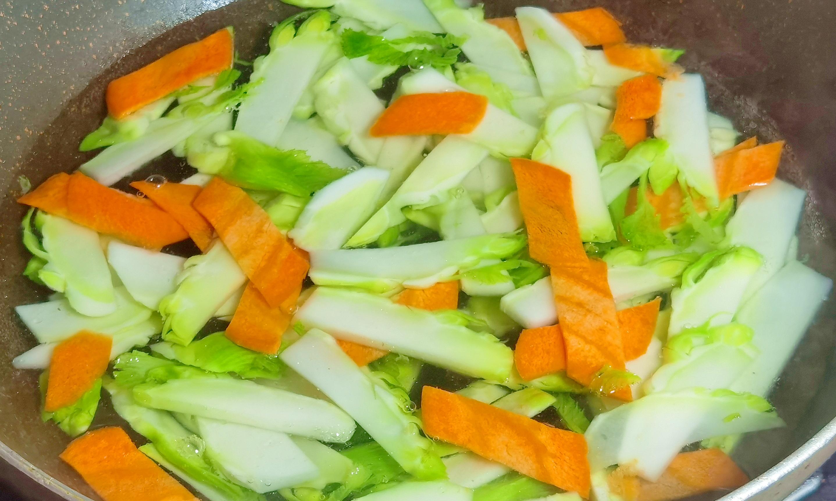 燒一鍋水,水開後加一小勺鹽和幾滴油(這樣能保持蔬菜的翠綠)。先把兒菜片倒進去,焯燙大約1分鐘——看到顏色變得更鮮綠、邊緣微微透明就可以了。接着把胡蘿蔔片也放進去,再燙30秒左右,胡蘿蔔變軟一些就好。