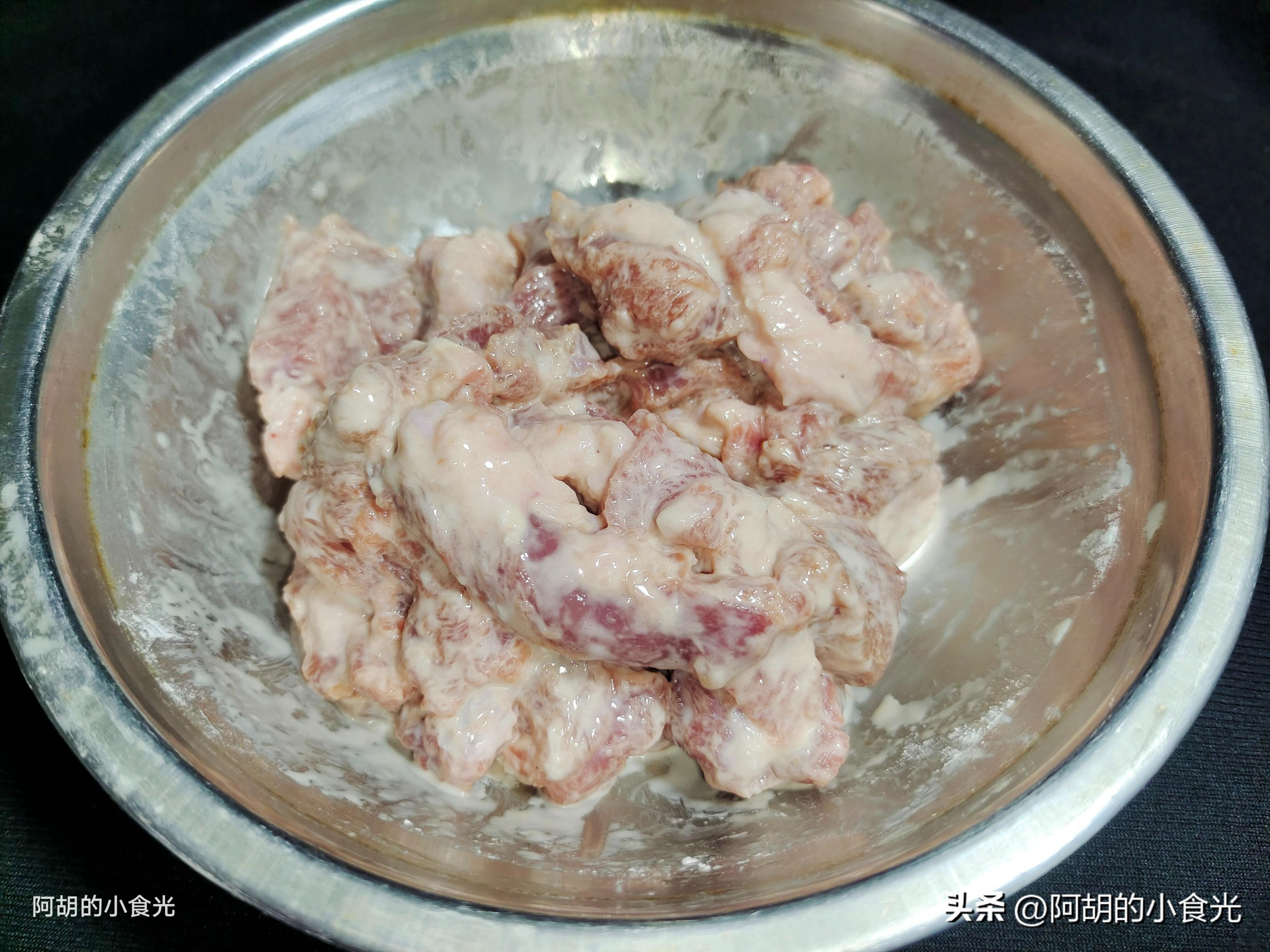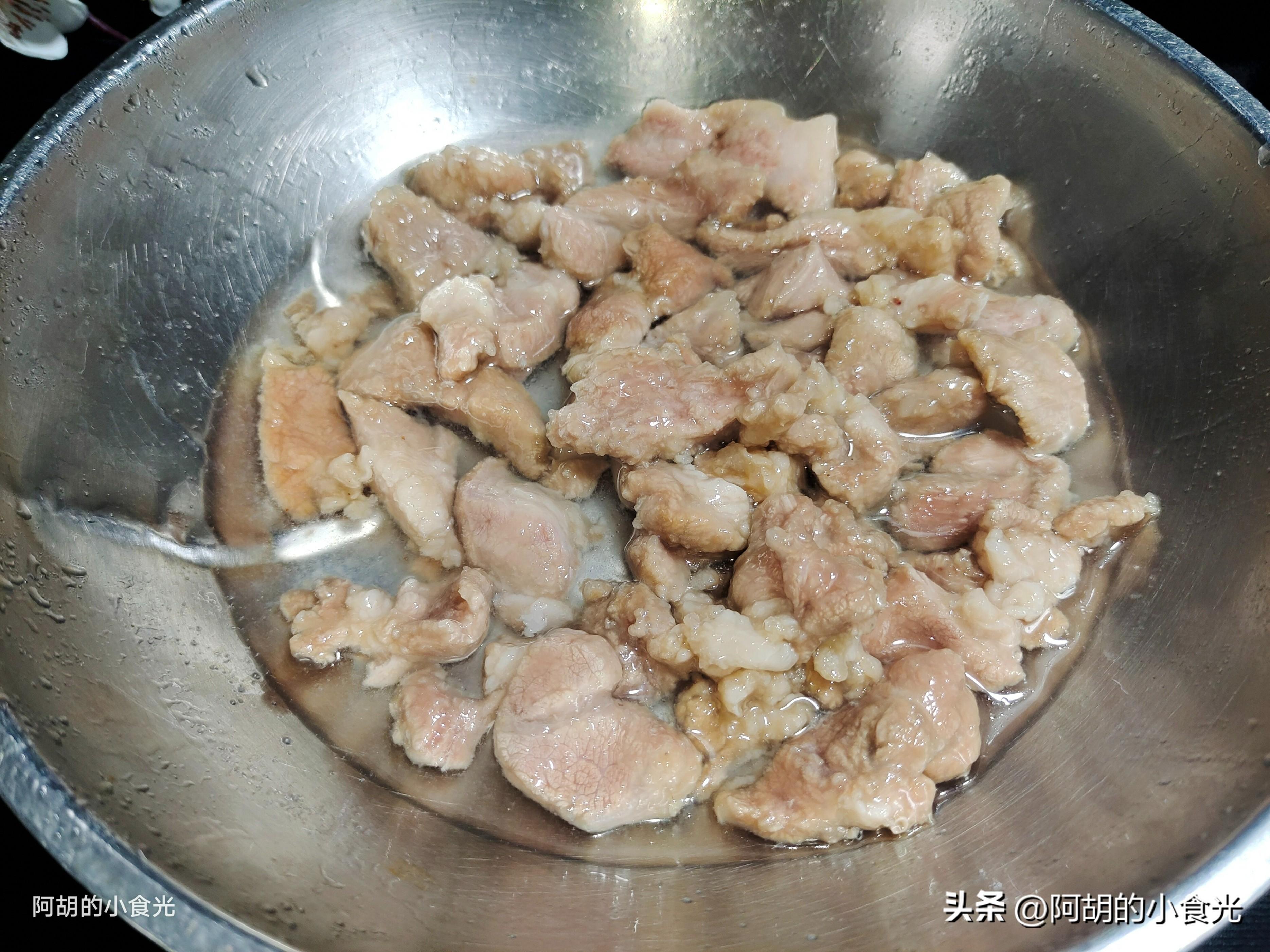 第二步:這個滑肉片的處理以前分享過很多次了,還是老辦法先把瘦肉切片放入碗中,撒入一些食鹽、雞精和生抽先抓拌均勻。而後分多次加入紅薯澱粉抓勻,紅薯粉的量要稍微多一些。如果感到有些幹,就稍稍地淋入一些清水抓勻,直至肉片都均勻裹滿粉漿即可待用。