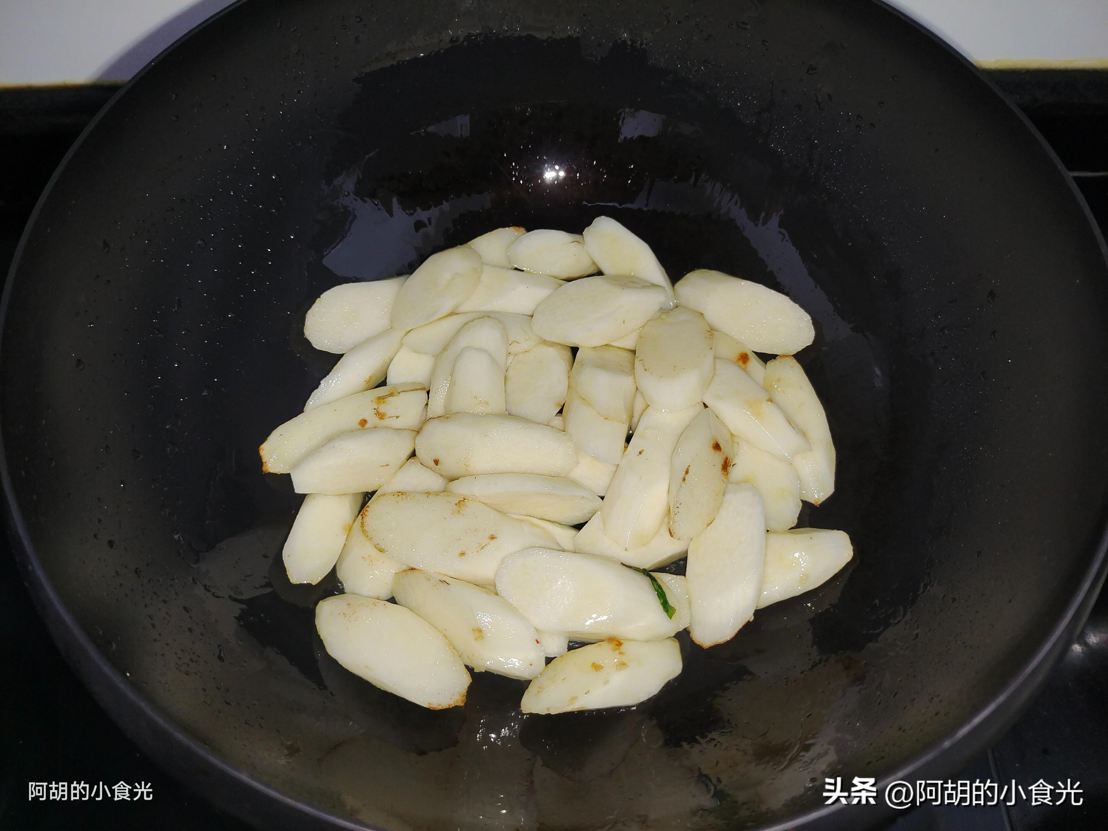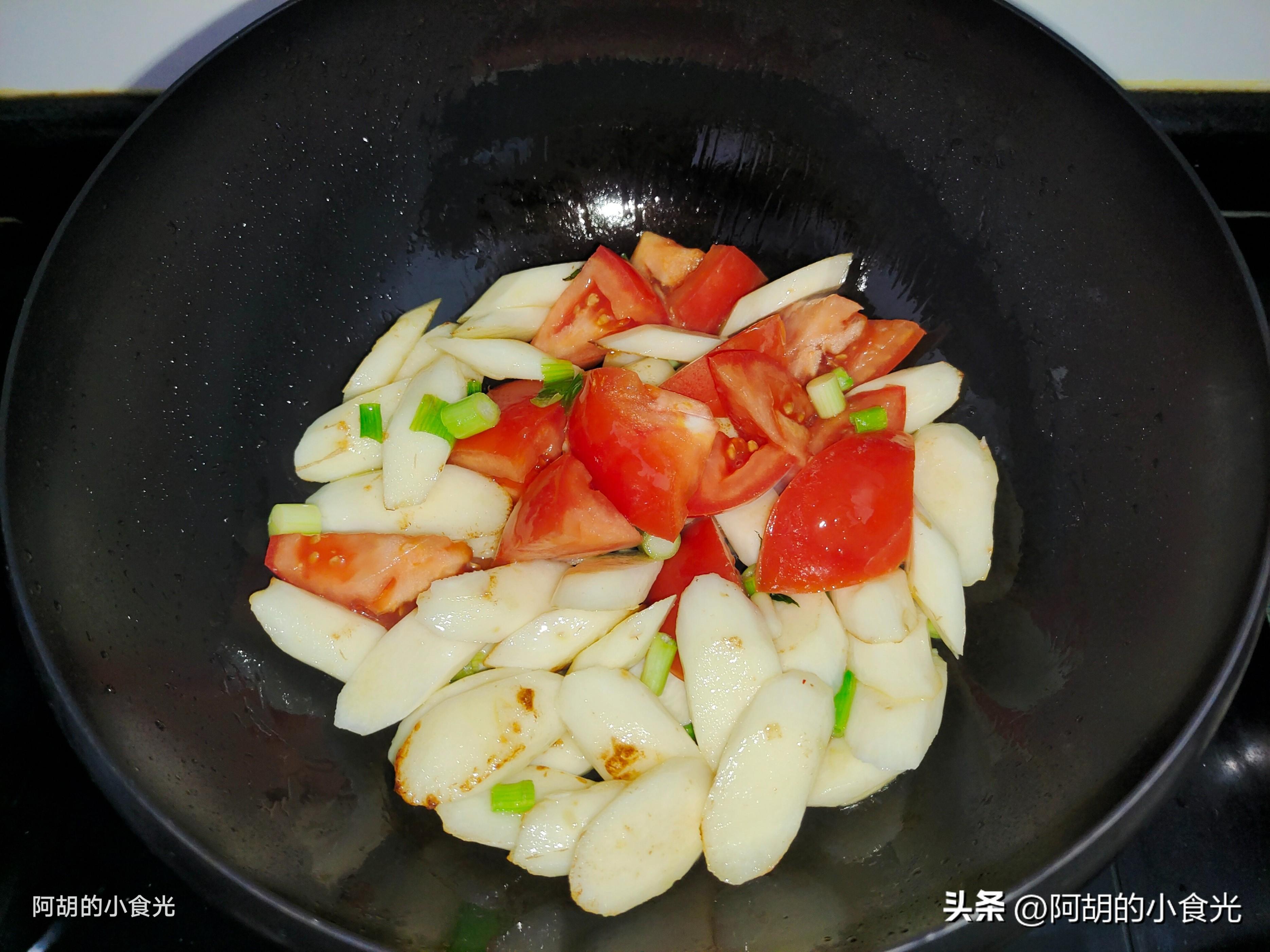 第四步:食材全部處理好後就可以開火烹飪了。還是先小火把鍋烘乾,再淋入一些花生油燒熱,而後把山藥片倒入鍋中煎炒至兩面微微焦黃的程度,再把蔥花和西紅柿塊倒入鍋中,轉爲大火炒一炒。