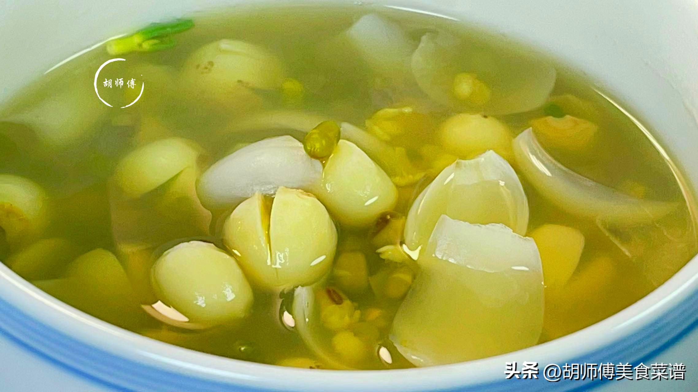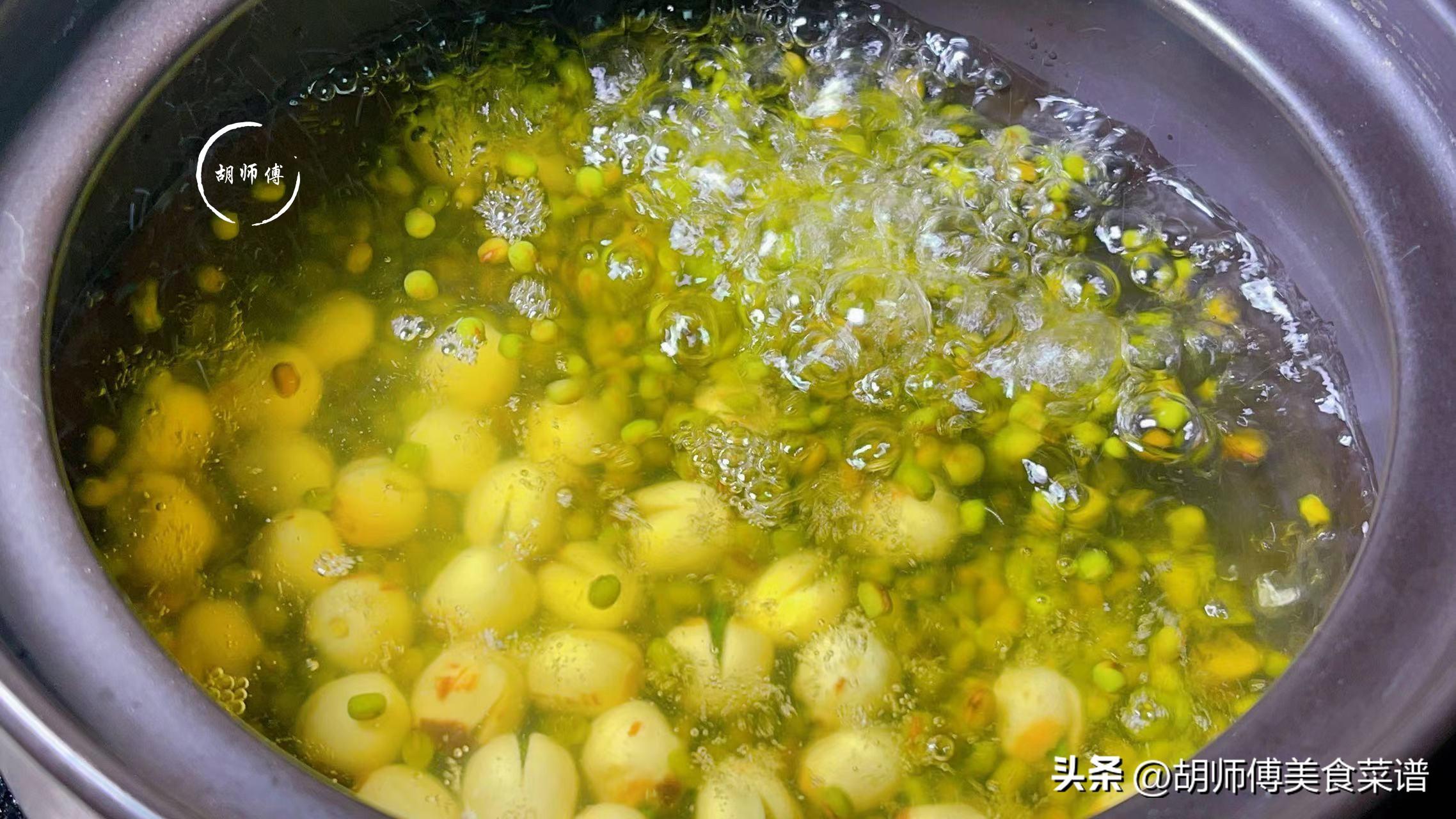 【食材準備】:綠豆50克、蓮子10克、新鮮百合30克、冰糖適量。