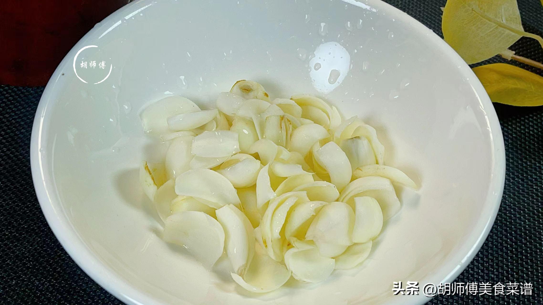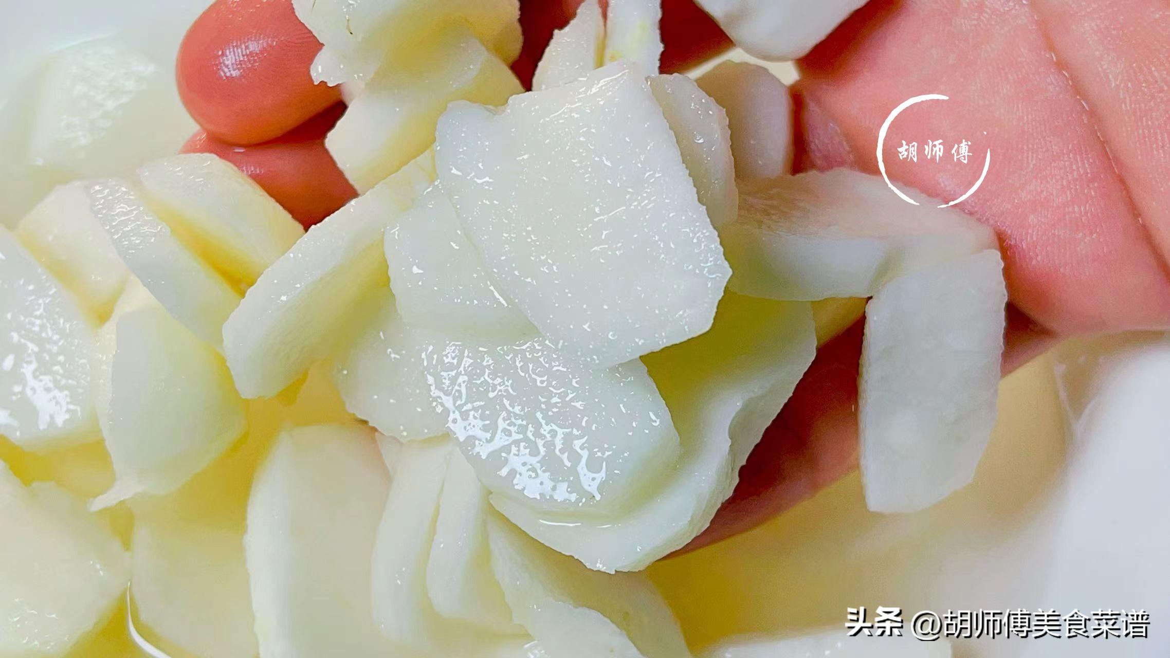 第二步:把荸薺削皮後沖洗乾淨,然後將荸薺切成0.3釐米厚的片狀備用。