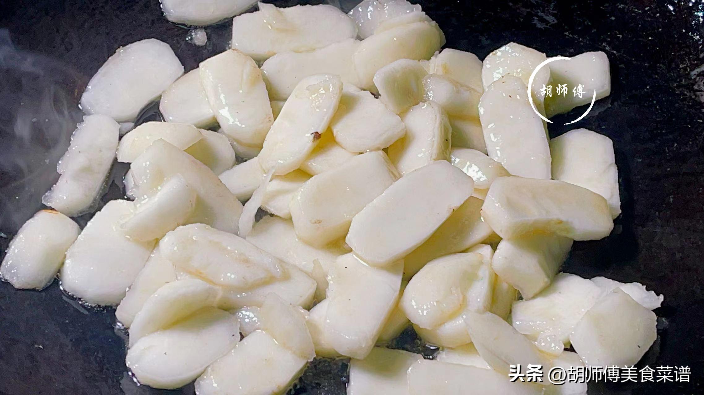 第四步:把鍋洗淨後,再把鍋燒熱,然後將少許油放入鍋中,大火將油燒熱後,將荸薺放入鍋中,大火將一會兒,直到將荸薺炒的斷生,接着將少許食鹽放入鍋中炒勻。