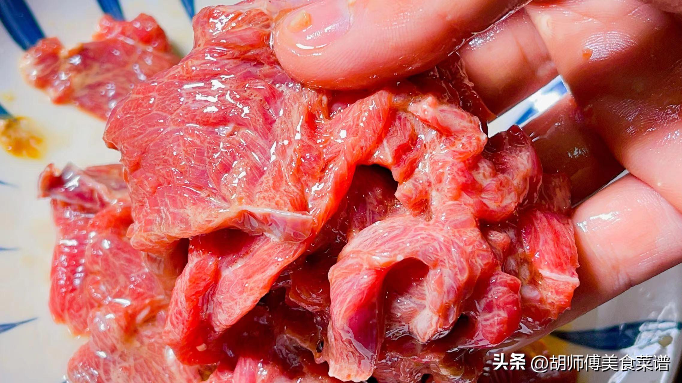 第一步:將牛肉沖洗乾淨後切成薄片,然後將牛肉、食鹽、雞精、胡椒粉、薑末、澱粉、一勺油全部放入盆中,將它們攪拌均勻備用。