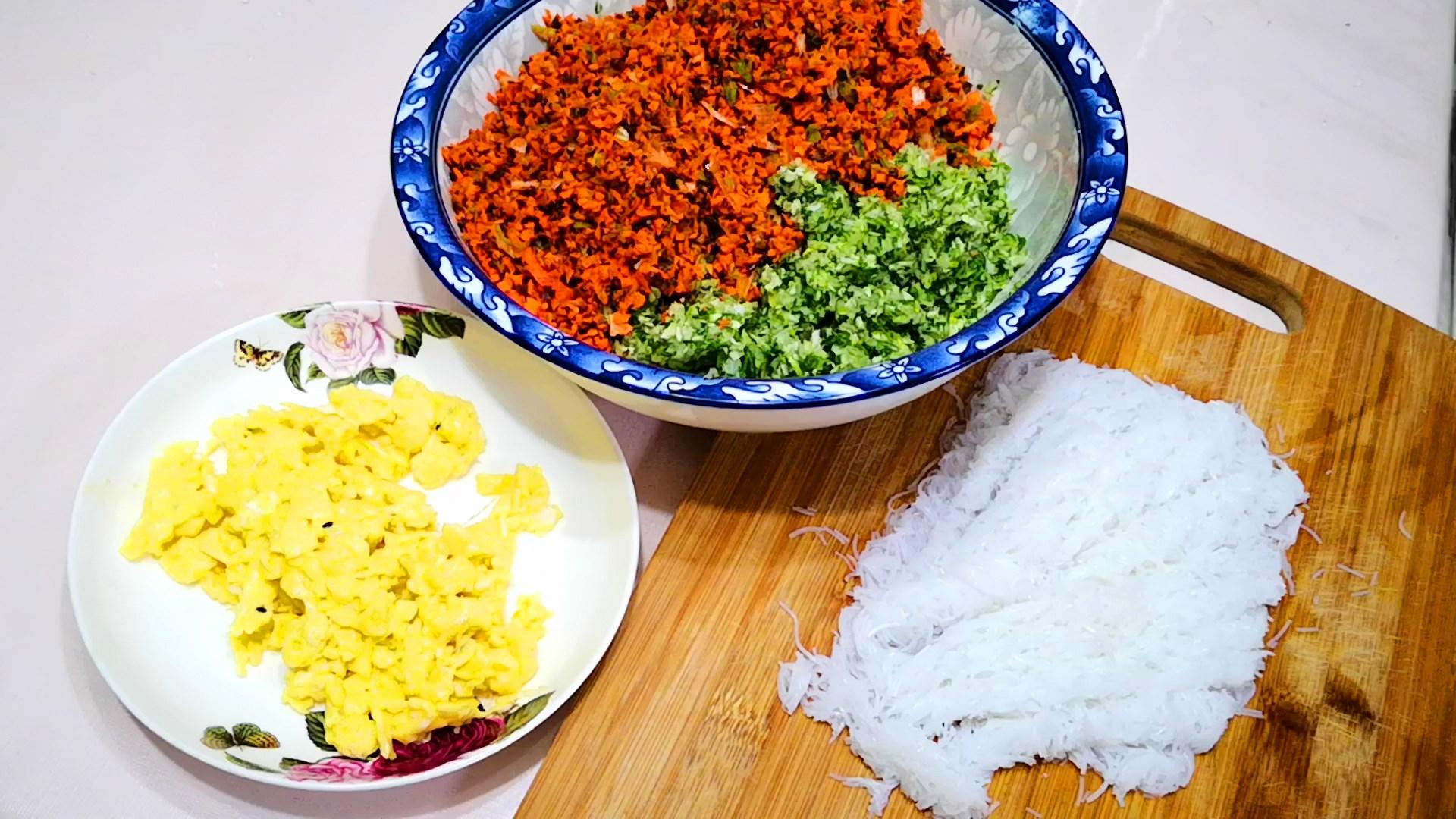 適量的粉絲用熱水泡軟後,再切碎剁細備用。