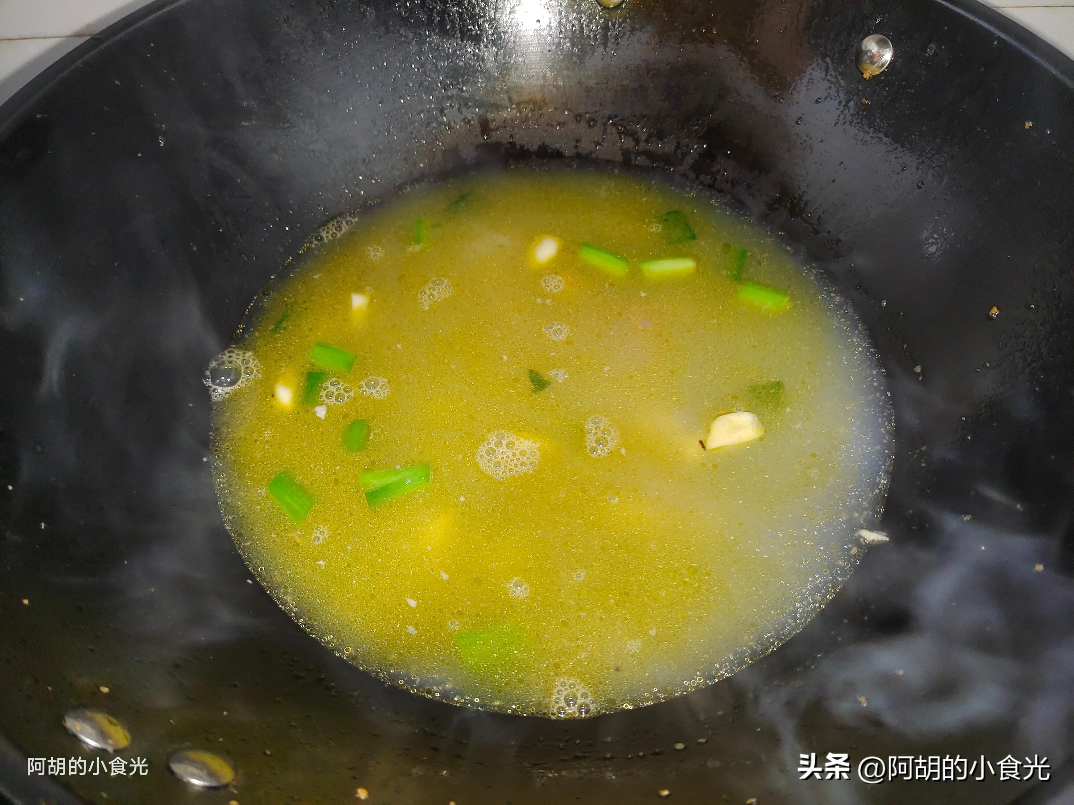 第四步:食材和配料都備好就可以烹飪了。鍋小火烘乾後淋入一些菜籽油燒熱,把蝦醬和蔥薑蒜一塊倒入鍋中小火炒出香味,接着直接把第二步中剩下的花蛤湯衝入鍋中,再轉爲大火煮開煮沸。