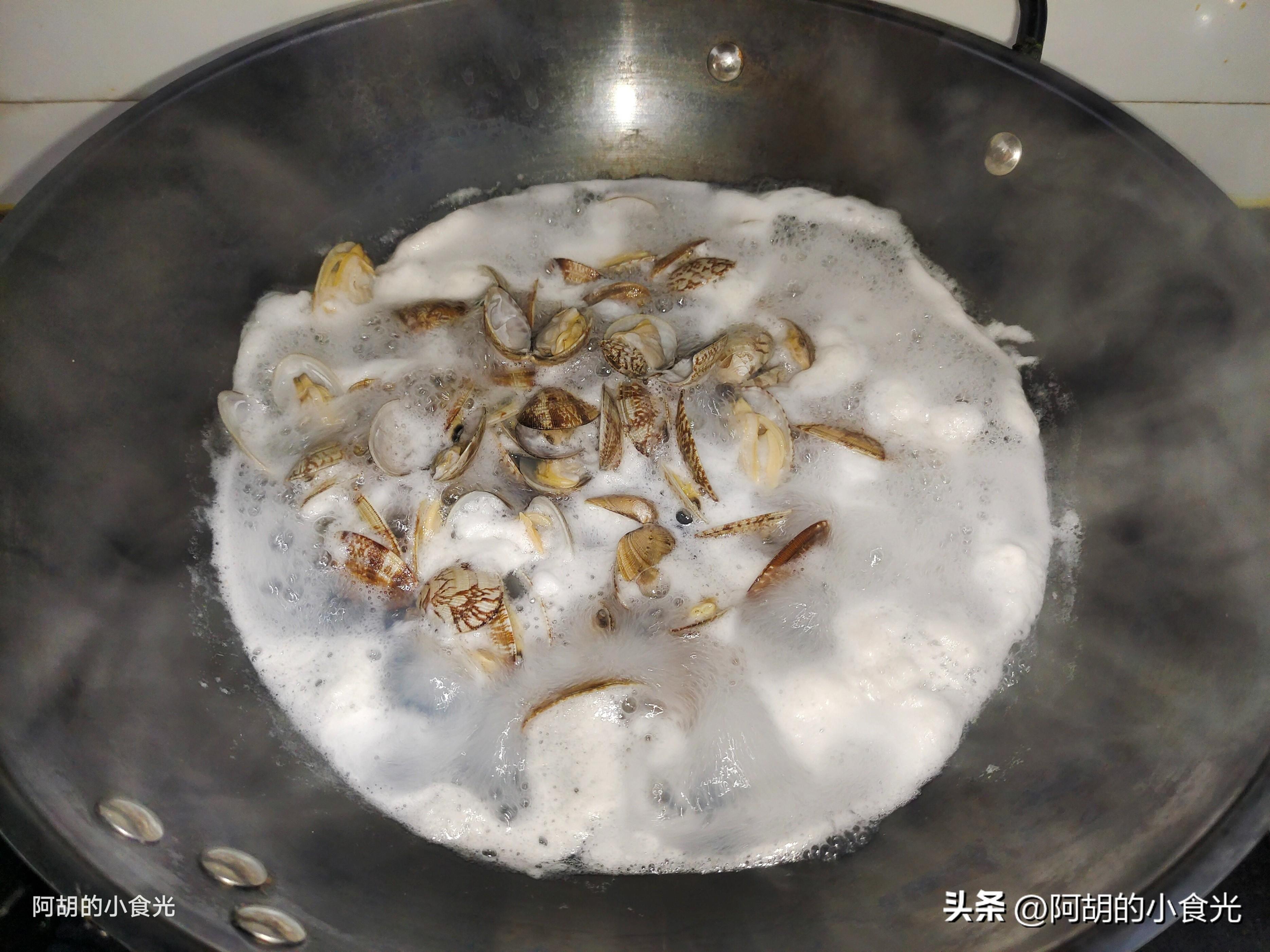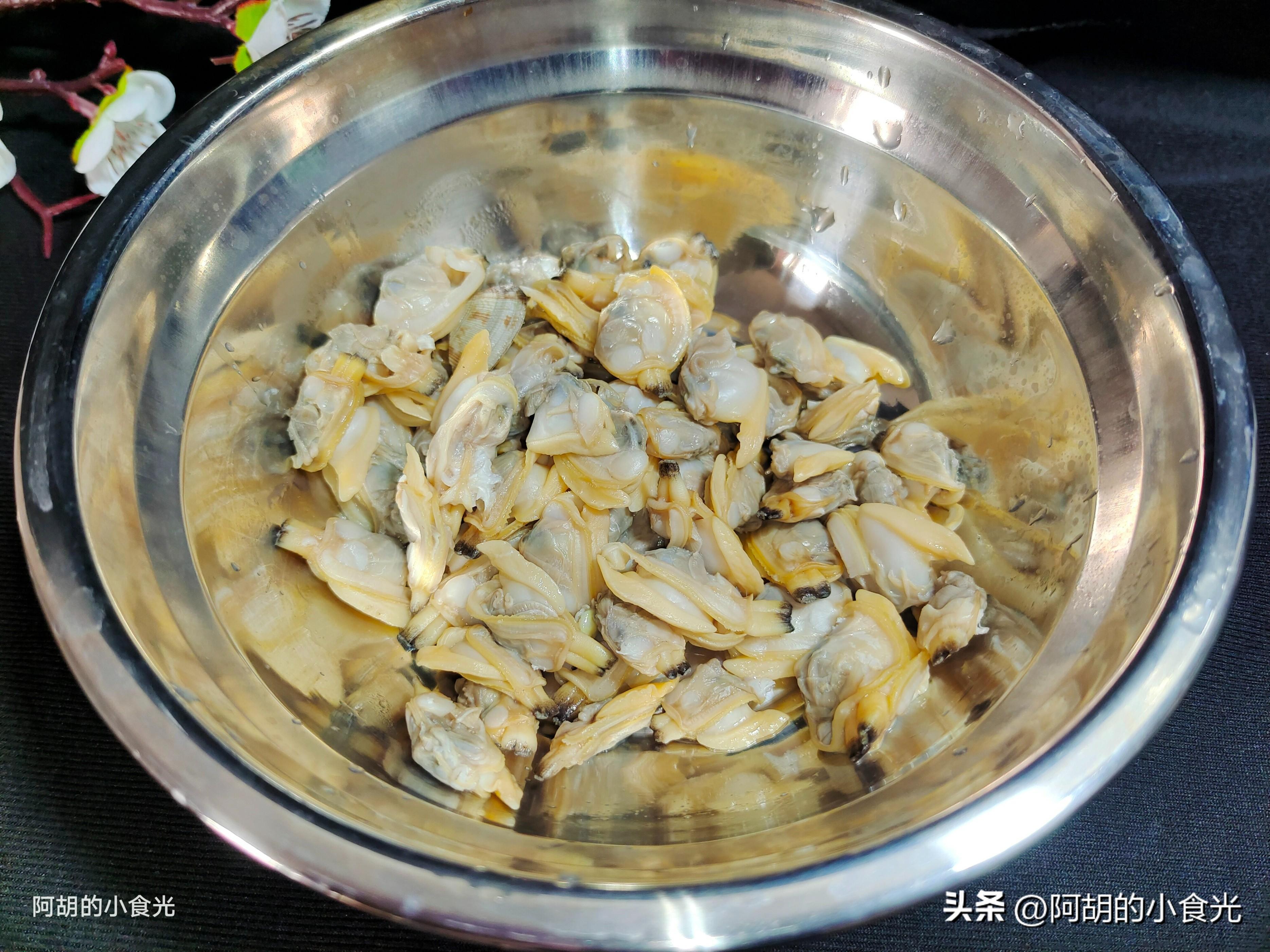 第二步:準備一些鮮活的花蛤,用清水多多地搓洗乾淨外殼,最好達到水中無泥沙的狀態即可。而後將其涼水下鍋,大火煮開煮沸讓其全部開殼後就關火。把花蛤撈出後稍微冷卻,再將花蛤肉挑出來,再用清水沖洗一下備用。而剩下的花蛤湯也不能浪費,倒出後置於一邊沉澱一下備用。