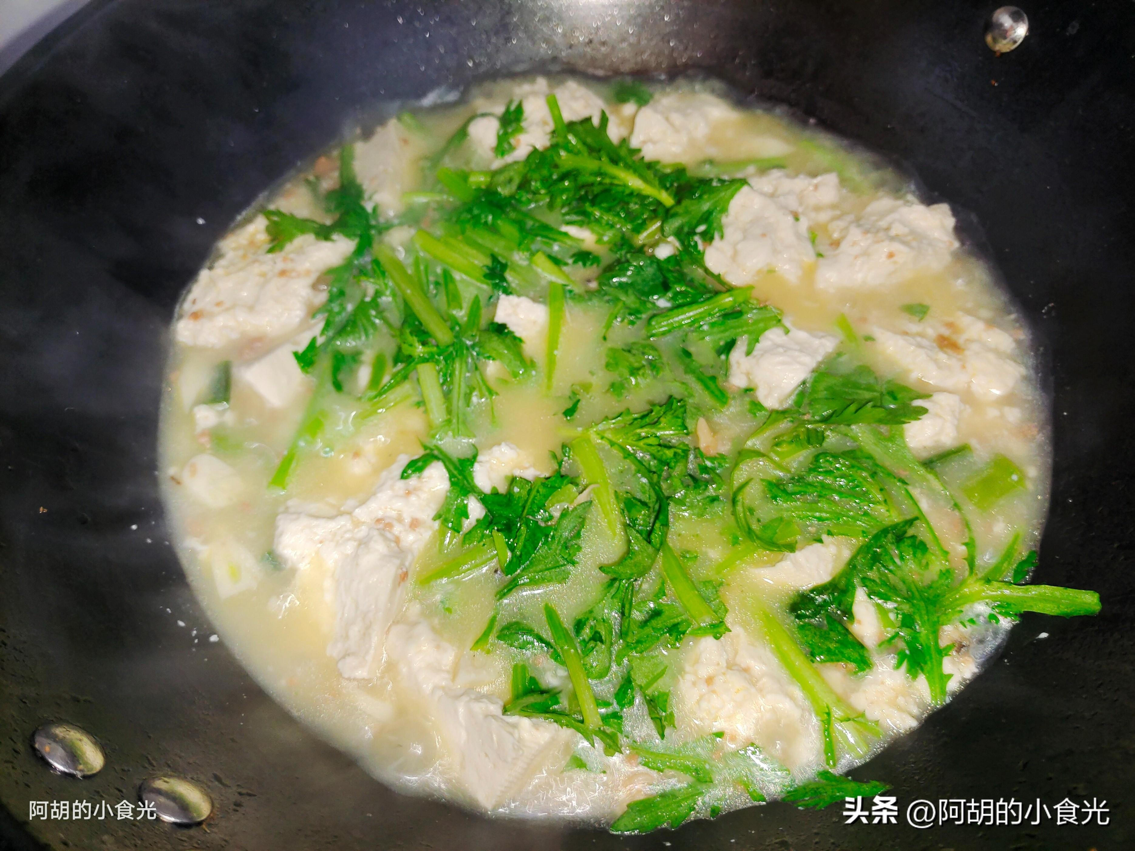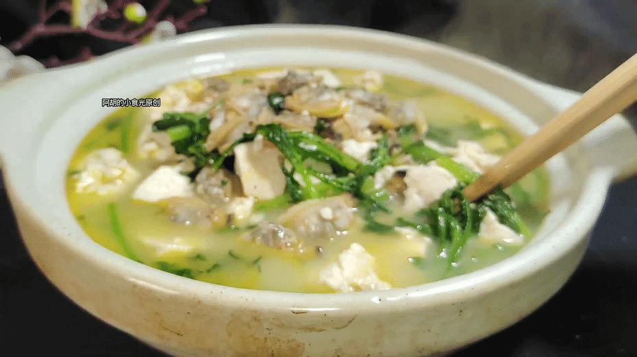 第六步:取出花蛤肉倒入鍋中,再將茼蒿稈先倒入鍋中,簡單翻拌一下讓這兩者沒入湯汁中,煮一分鐘後再把茼蒿葉子也下鍋,翻拌均勻燙十幾秒鐘後就可以出鍋裝盤了。非常鮮爽的一道燉豆腐,這個豆腐被燉煮的軟嫩無比,而且很是入味,滿口都是鮮美好味道,還有茼蒿的清香味,就連最後的湯汁也不能錯過,感興趣的一定要試一試這個做法。