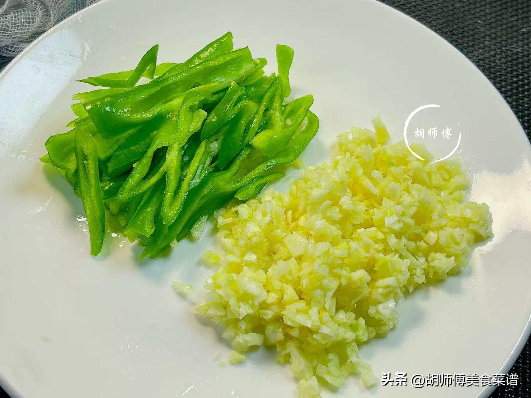 第二步:將青椒、大蒜籽都沖洗乾淨,然後將青椒切成細絲,將大蒜籽切成碎末,切好的大蒜末最好用水衝一下,這樣可以去除大蒜末中的苦味。