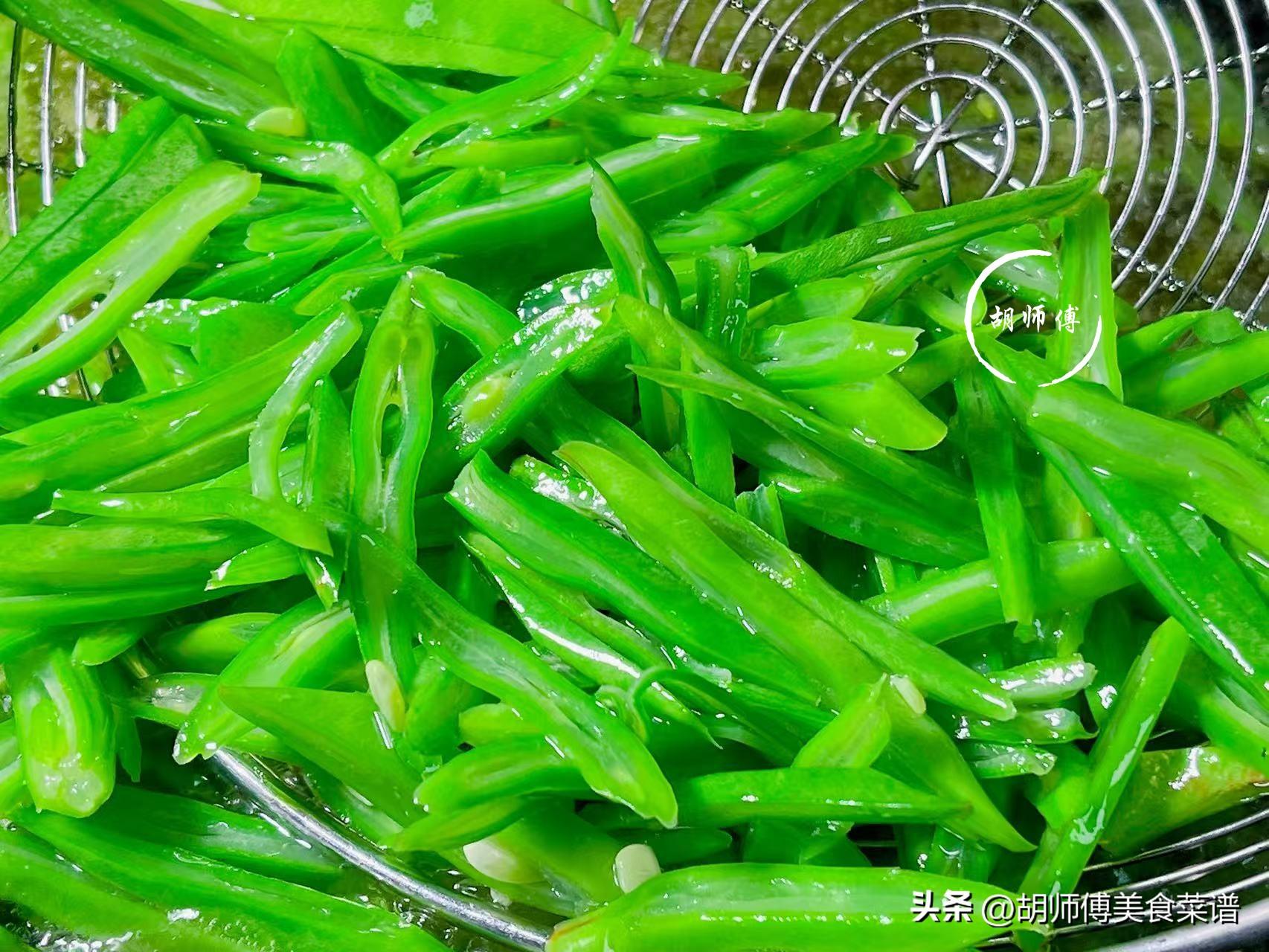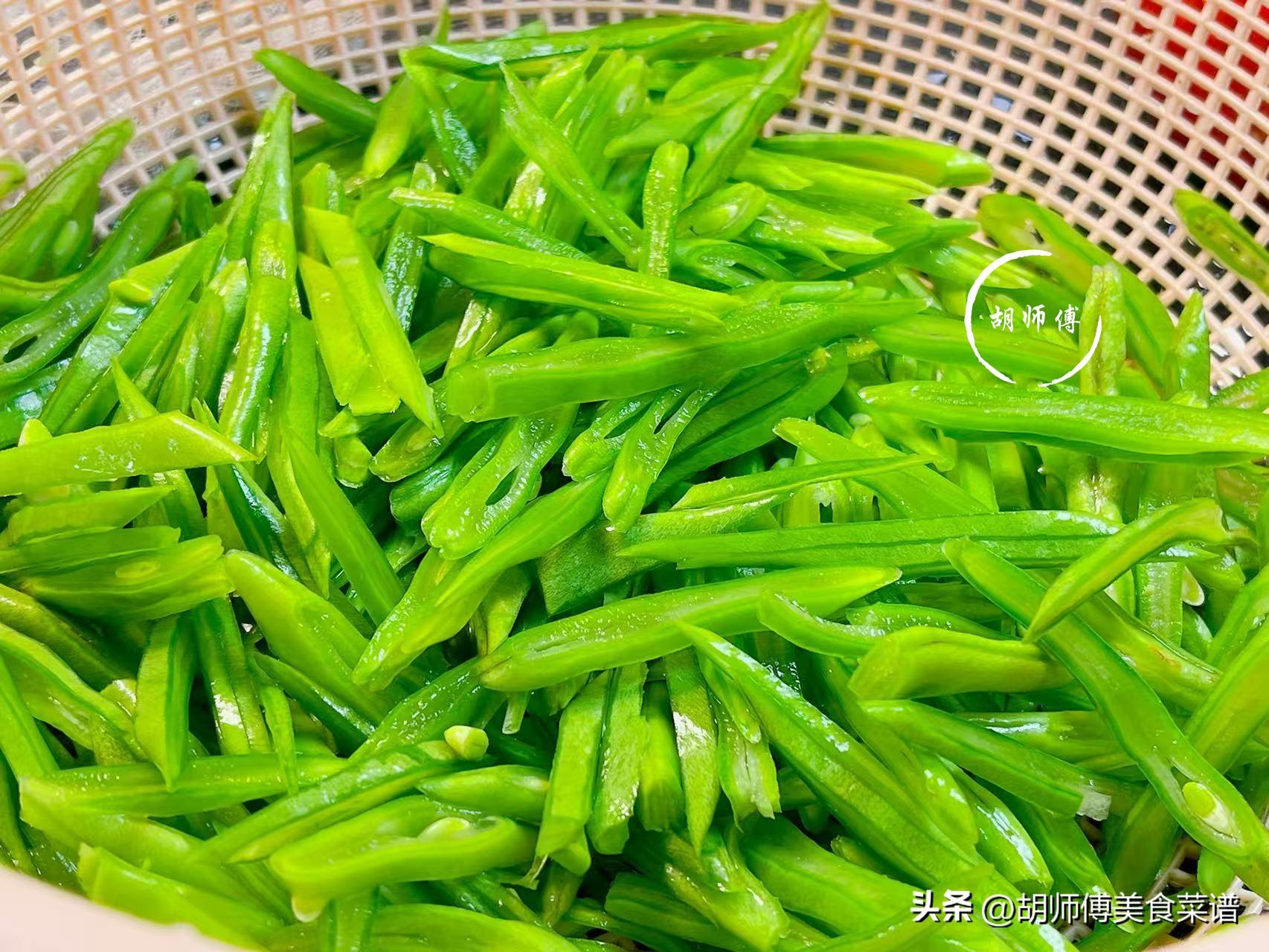 第一步:買扁四季豆,一定要買顏色翠綠,按壓着比較硬的,如果顏色發黃,按壓着很軟,這是扁四季豆放久了,味道不好。買回家的扁四季豆,先將莖抽的扔掉,然後將扁四季豆放入淡鹽水中浸泡30分鐘,時間到後,再把扁四季豆撈出沖洗乾淨,接着斜着將扁四季豆切成細絲備用。