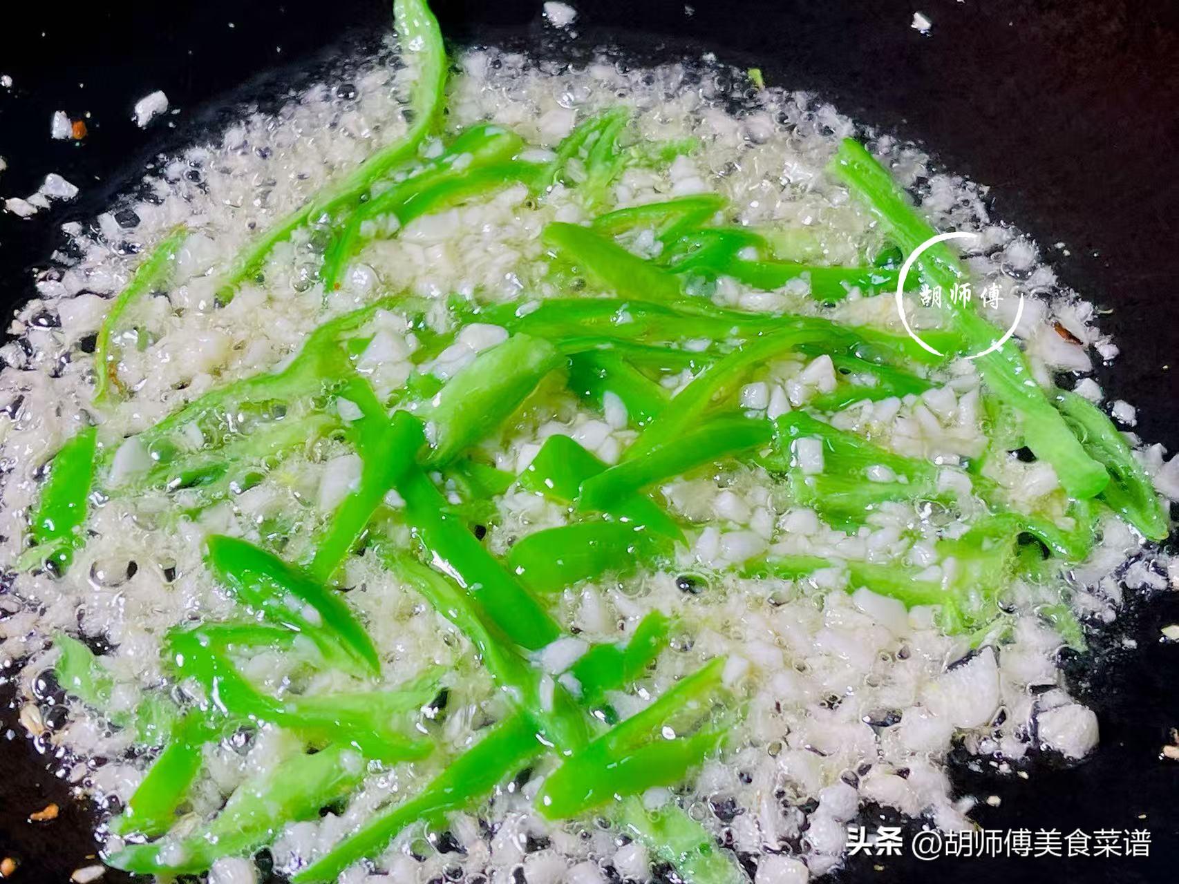 第四步:鍋中留少許底油,把蒜末放入鍋中,大火將蒜末炸10秒後,把青椒絲放入鍋中,繼續炒5秒,這樣可以激發出蒜末和青椒的香味。