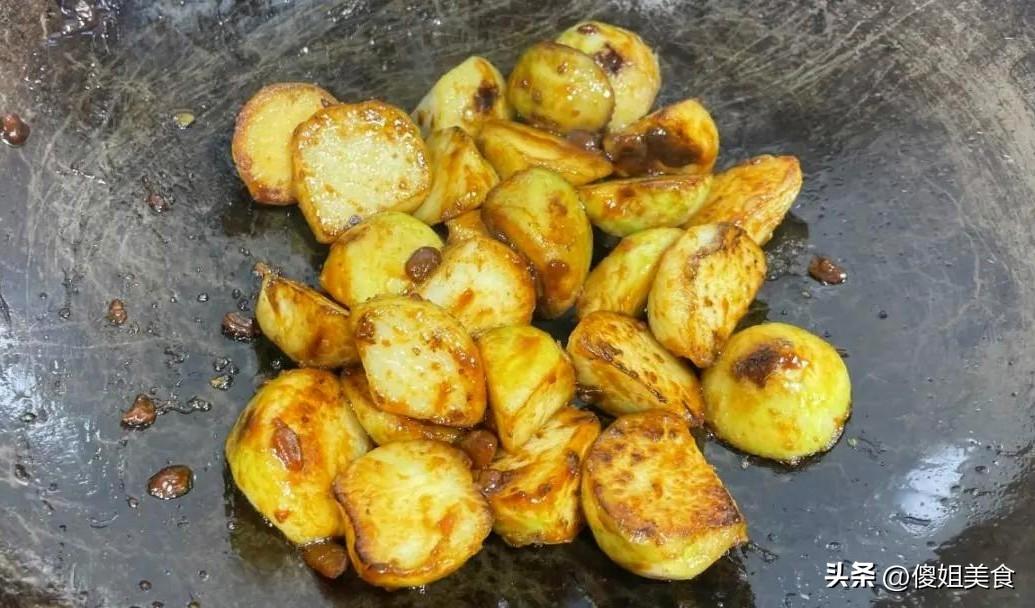 第三步:把瀝乾水的芋頭塊倒進鍋裏,轉中大火,開始翻炒,讓每一塊芋頭都均勻地裹上那層紅亮的醬汁。炒個一兩分鐘,你會看到芋頭邊緣有點變得透明。