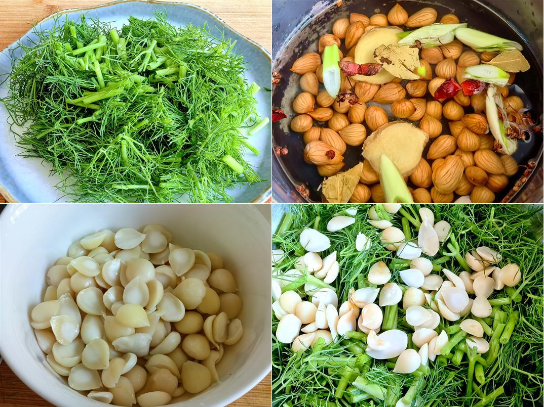 3. 將茴香菜和杏仁放入碗中,加蒜末、少許生抽、香醋、香油、鹽,拌勻即可。