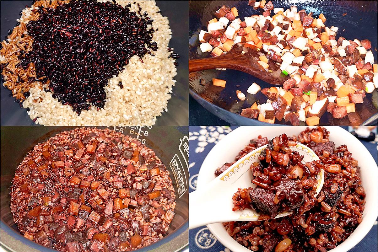 這飯最大的好處就是——省事又豐盛!香菇的鮮、胡蘿蔔的甜、臘腸的香,全都融進雜糧裏。糙米紅米黑米保留了更多維生素和礦物質,臘腸少量使用既能提味又不至於攝入過多鹽分。一鍋裏有菜有飯,特別適合不想多折騰的時候。