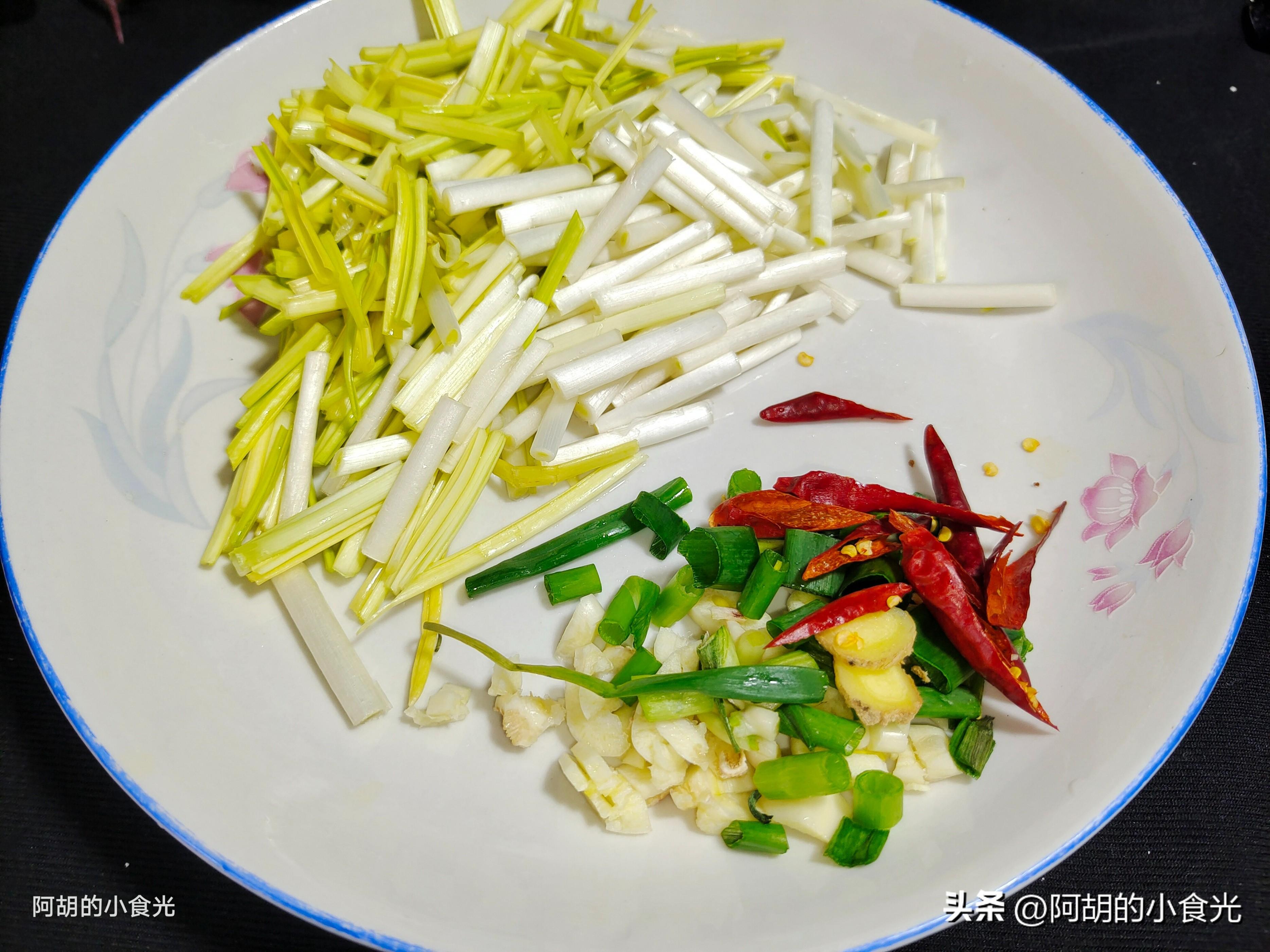 第二步:以上的食材可以自行更換搭配,但是也有必須要有的食材,蒜黃就是一個,清洗乾淨後切段即可,再來一些蔥薑蒜和幹辣椒絲作爲小料待用。