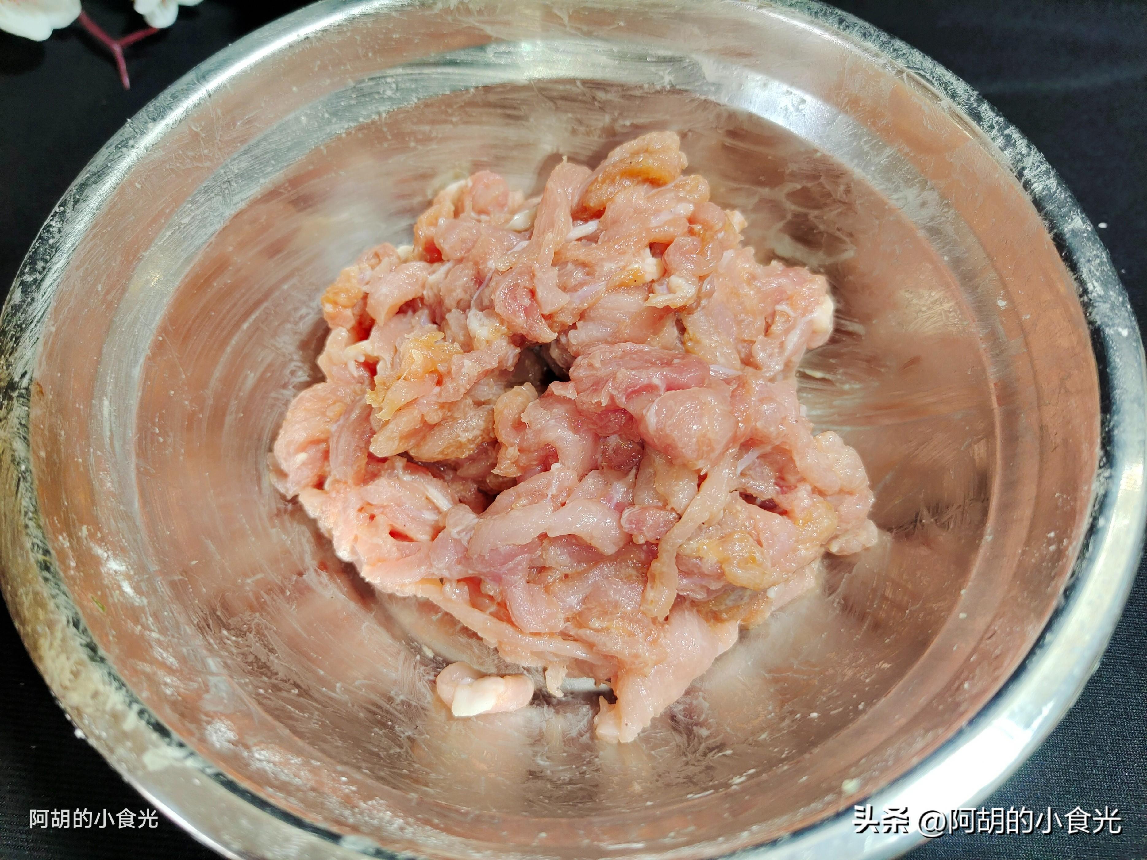 第三步:下面再來處理肉絲部分,這裏建議要提前碼味漿一下。就往肉絲中加入一些食鹽、雞精、少許幹澱粉抓勻即可。
