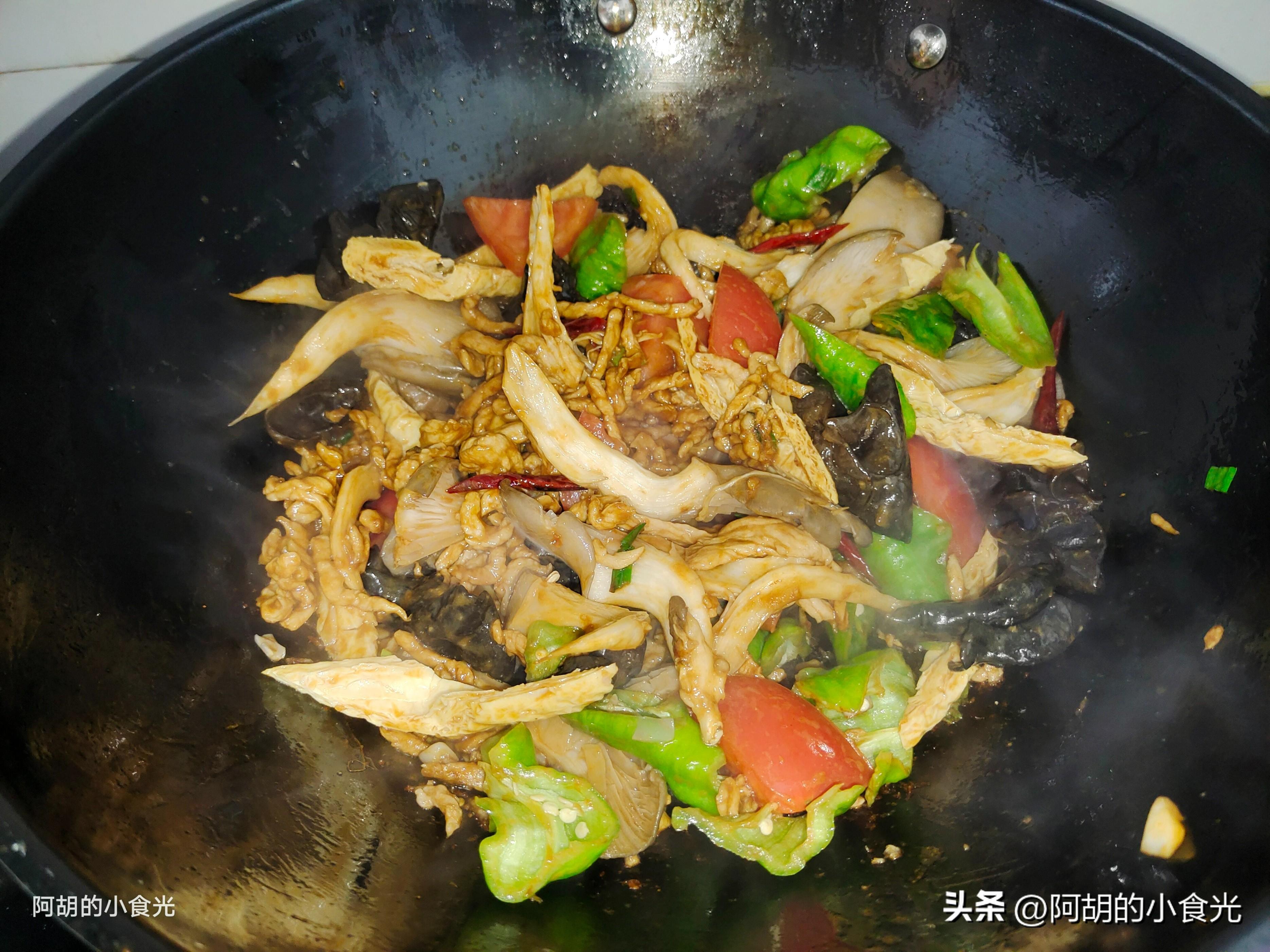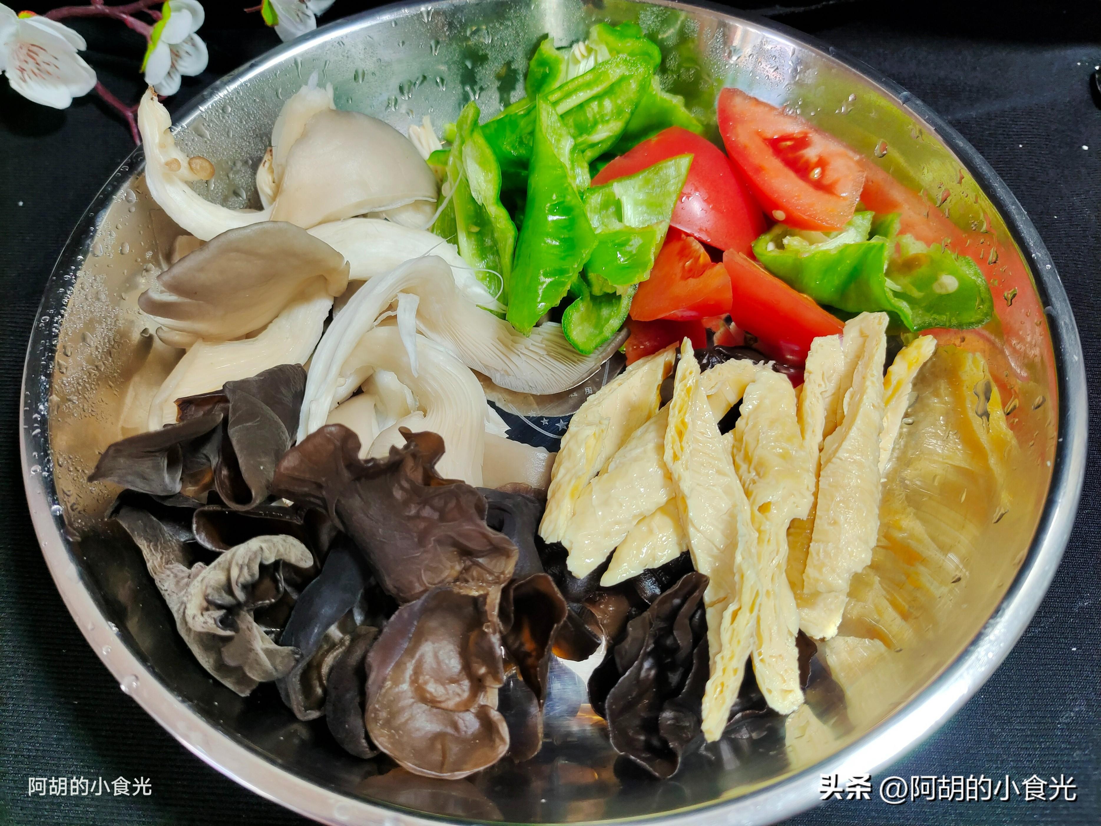 食材稍微有些多,其實大部分食材可以自行搭配的,我這裏有平菇、肉絲、西紅柿、青椒、木耳、腐竹、蒜黃等,主要的調味來自於黑胡椒粉、白醋和芝麻香油,味道是酸辣香濃,炒的時候就能聞到濃濃的香味,很是勾人食慾的。