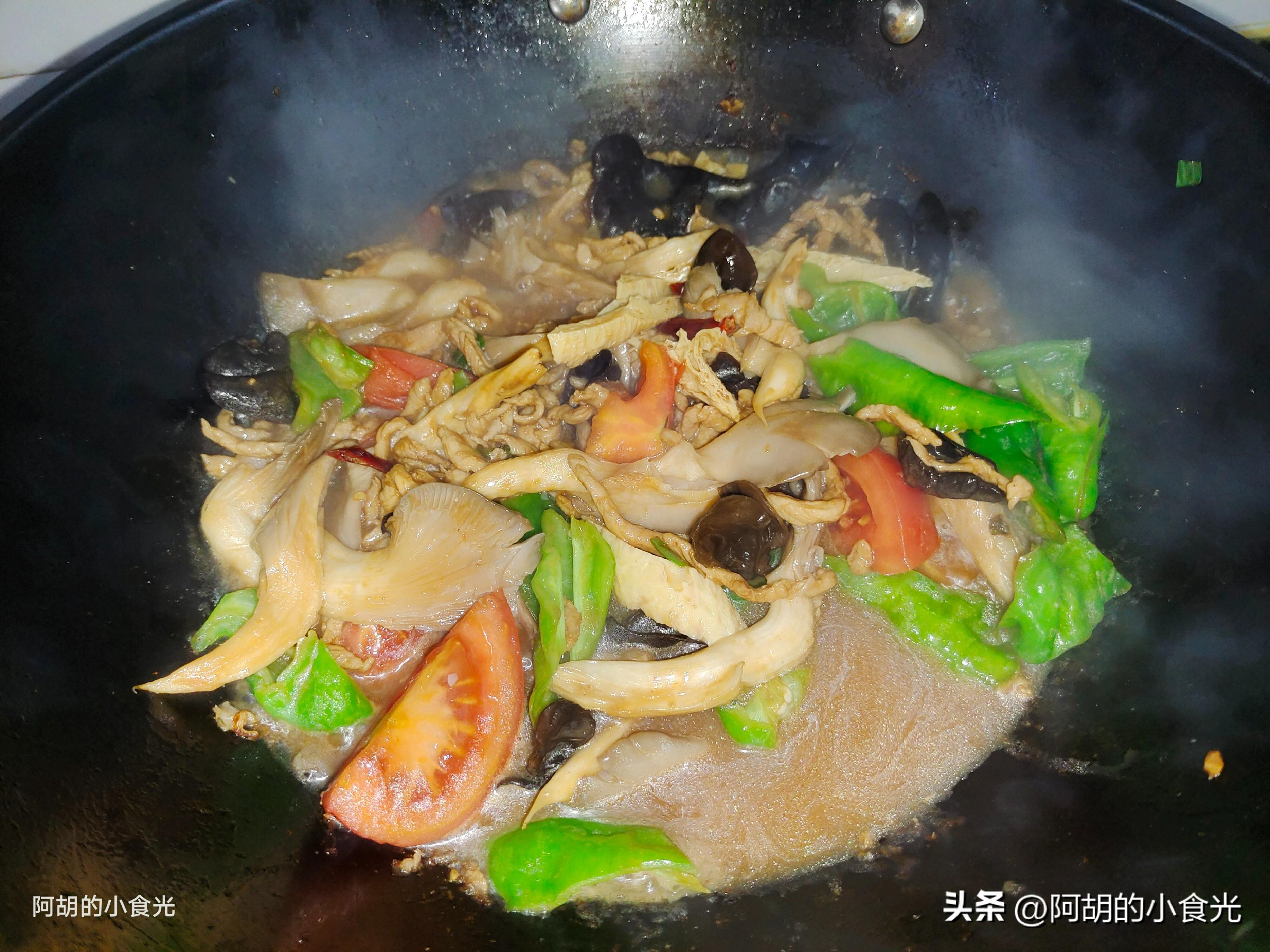 第五步:把青椒、西紅柿塊、腐竹、木耳、平菇都一塊倒入鍋中,轉爲最大火快速地炒一炒,因爲這道菜要帶一些湯汁,所以再淋入適量的開水。調味很重要,白醋、黑胡椒粉這兩樣都不要缺,按照自己口味稍微多加入一些,再來食鹽、雞精和白糖快速翻炒均勻,激發出醋香和胡椒的香味。