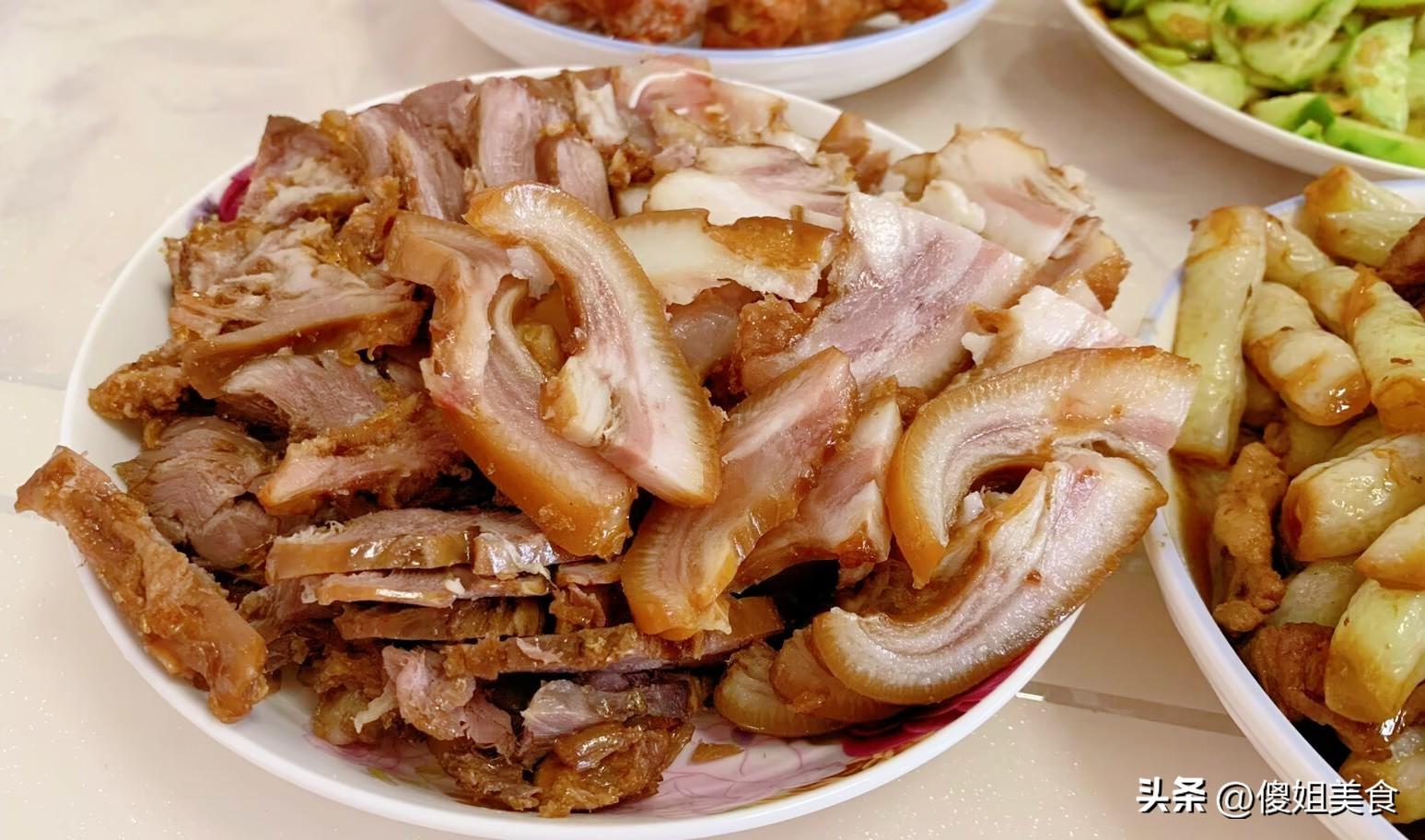 還有這盤燒肉,也是熟食店買的現成的,喫的時候切成厚片,裝盤上桌。旁邊配一小碗搗好的蒜泥,加點生抽和香油。拿一片燒肉,在蒜泥裏打個滾,往米飯上一放,肉香、蒜香、飯香混合在一起,一口下去,別提多下飯了!公公就愛這一口,常說“喫肉不喫蒜,香味少一半”。