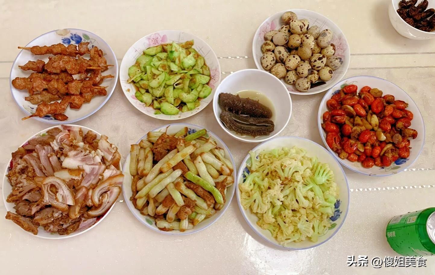 看看今天的菜色:五花肉炒白芸豆、烤肉串、清炒花菜、燒肉、涼拌黃瓜、蒜蓉小龍蝦尾,還有煮鵪鶉蛋,外加給兩位老人特意準備的兩隻海蔘。擺上桌,紅的綠的,熱氣騰騰,看着就舒坦。