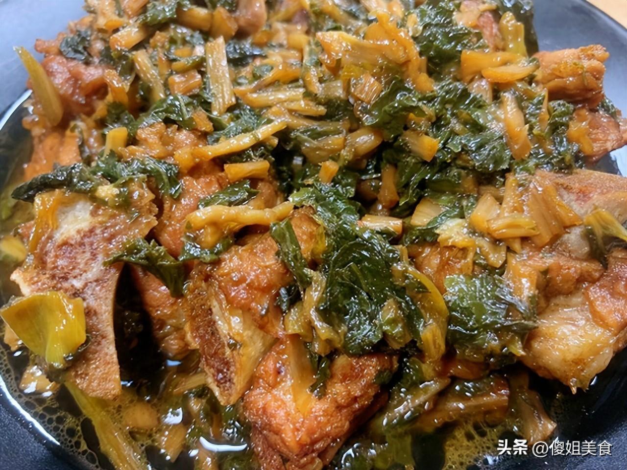 排骨燉得酥爛脫骨,用筷子一夾肉就下來了。而原本乾巴巴的蘿蔔纓子,此刻吸飽了精華,變得黑亮油潤,入口是勁道的口感,先是濃郁的肉香,嚼着嚼着,一絲獨特的、類似於梅乾菜但更清新的回甘就湧了上來,解了所有的油膩。