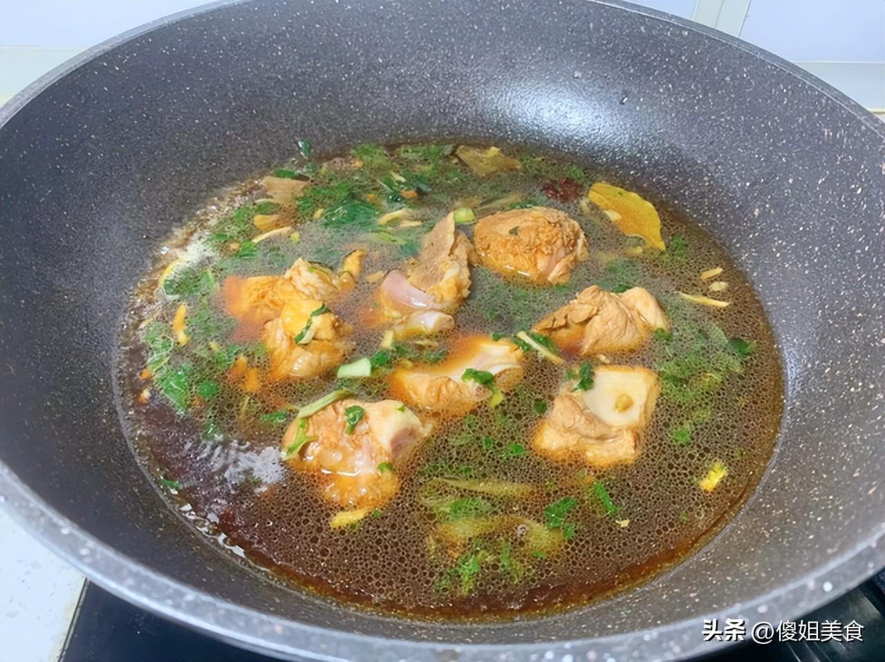 7、時間到,打開鍋蓋,哇,香氣撲鼻,這時可以根據口味加點鹽調味(因爲醬油有鹹味,先嚐嘗再加)。轉成大火,開始收汁。不用收得太乾,留一些濃稠的湯汁,用來拌飯,絕了,汁收得差不多,就可以關火出鍋了。