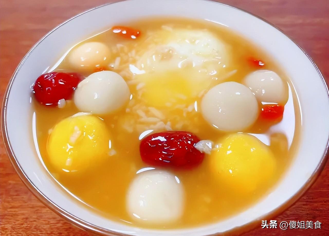 用小勺子輕輕攪動,舀起一勺,吹一吹,送入口中,先是醪糟的微酸帶甜,然後是紅糖的醇厚甘甜,小圓子軟糯Q彈,紅棗煮得軟爛,帶着果香,偶爾咬到一顆枸杞,又是不同的甜味層次。最妙的是那雞蛋,吸飽了湯汁的味道,滑嫩可口。