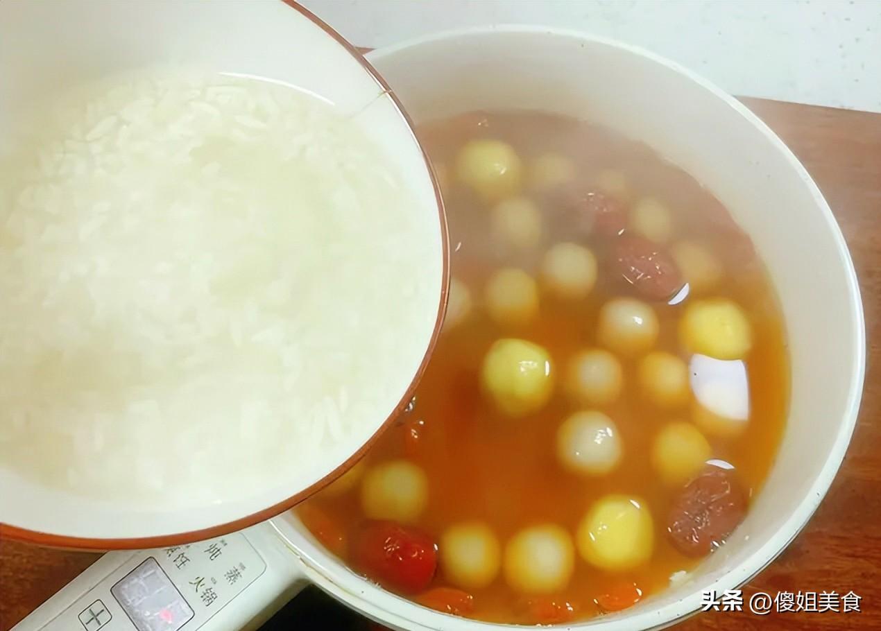第二步:鍋里加水燒開,先放入紅棗和小圓子,小圓子下鍋後會沉底,等它們一個個浮起來,就說明熟了。這時候可以加入黃米湯圓(如果你準備了的話),一起煮到浮起。