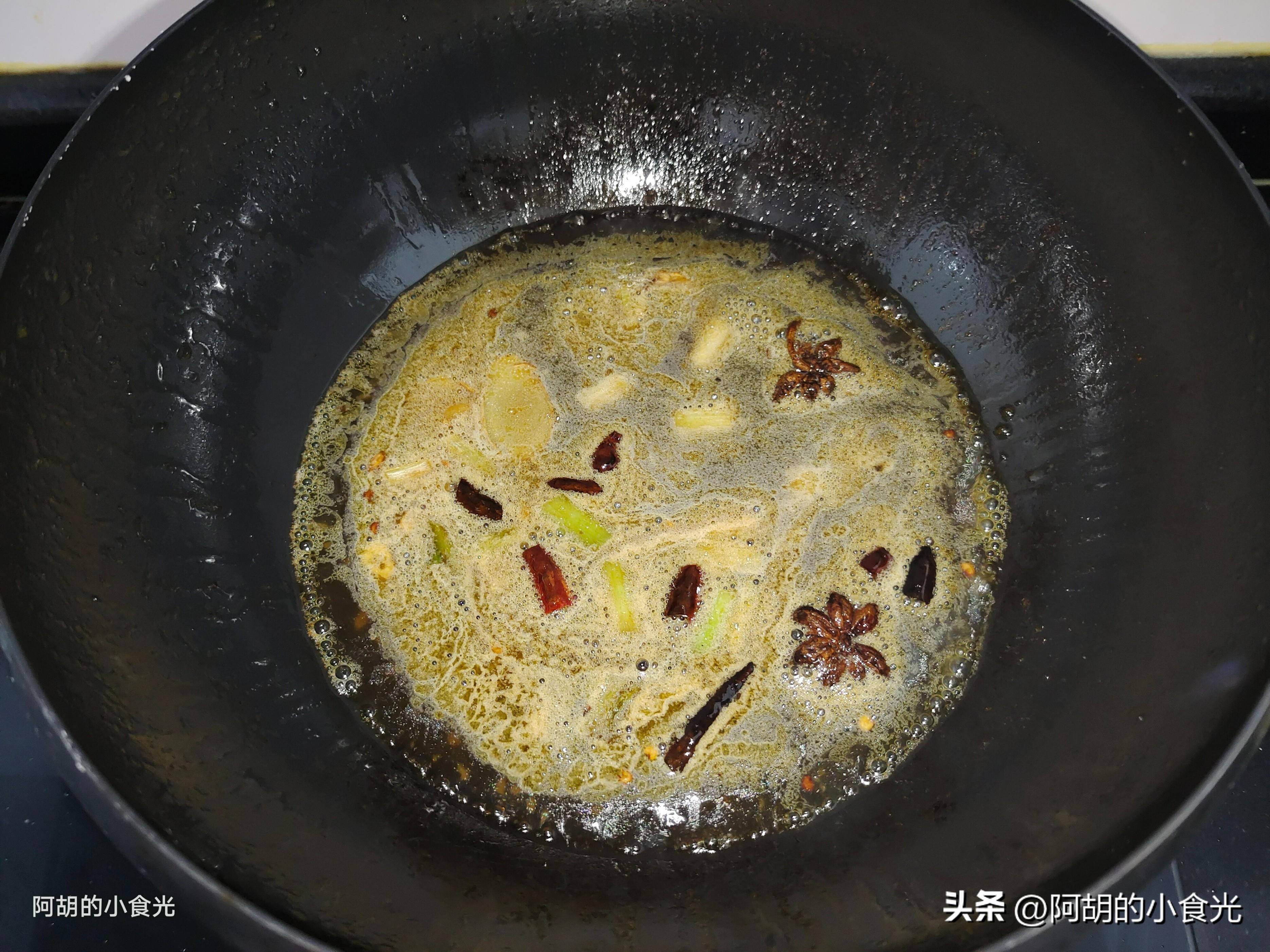 第三步:食材都比較簡單,全部備好後就可以開火烹飪了。先把鍋烘乾,淋入一些菜籽油燒熱,先把八角下鍋小火炸出香味,再把蔥薑蒜和幹辣椒倒入鍋中炒出香味,而後淋入一些生抽和蠔油熗出香味,接着就直接衝入開水適量。