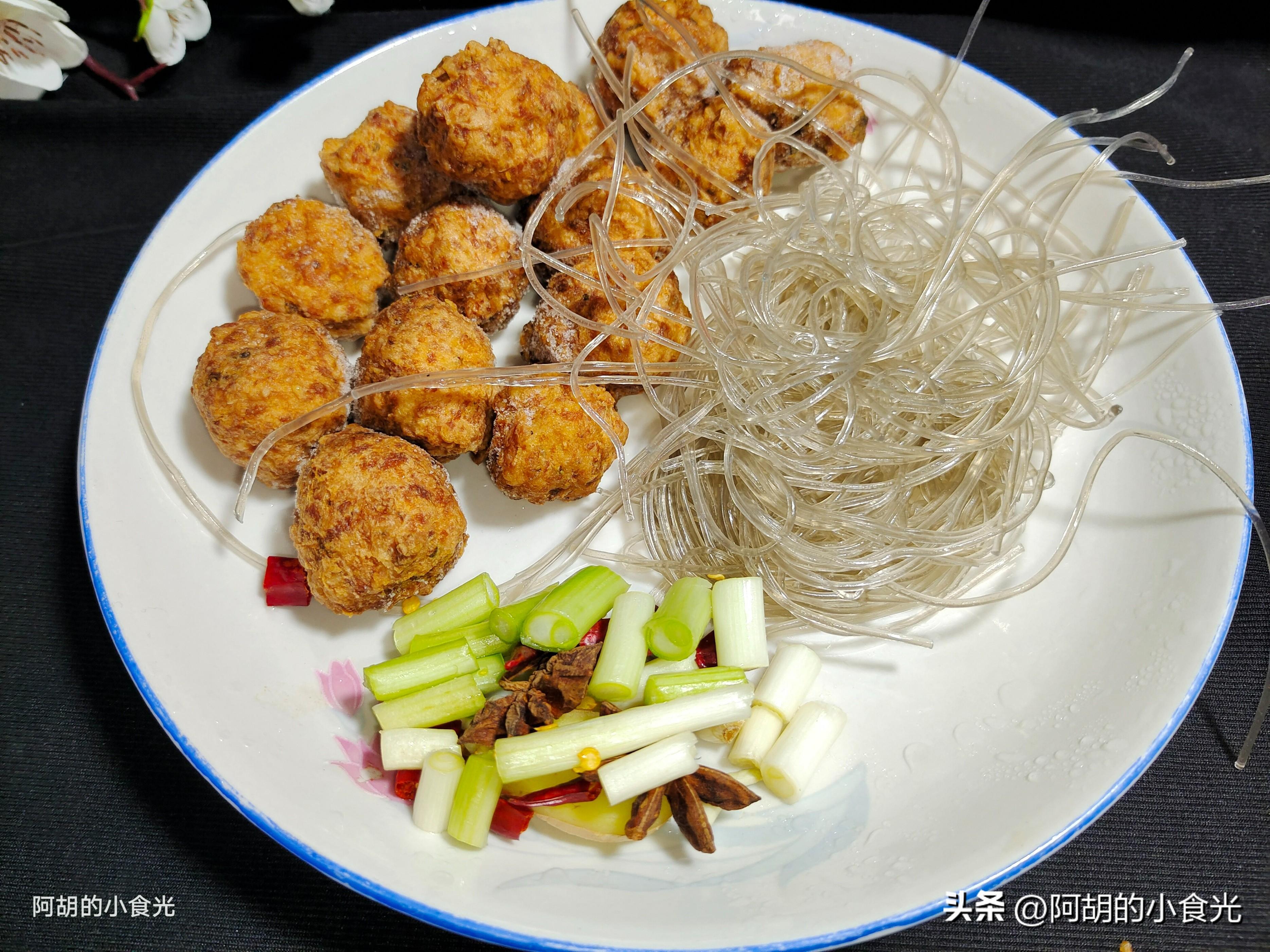 第二步:還有幾個油炸肉丸也要備好,油炸的肉丸可以多備一些,平時用冰箱冷凍起來,想喫的時候取出直接下鍋燉即可。再來一把乾粉條用溫水泡軟後備用。小料就備一些蔥薑蒜和幹辣椒,再來兩個八角用來提味即可。