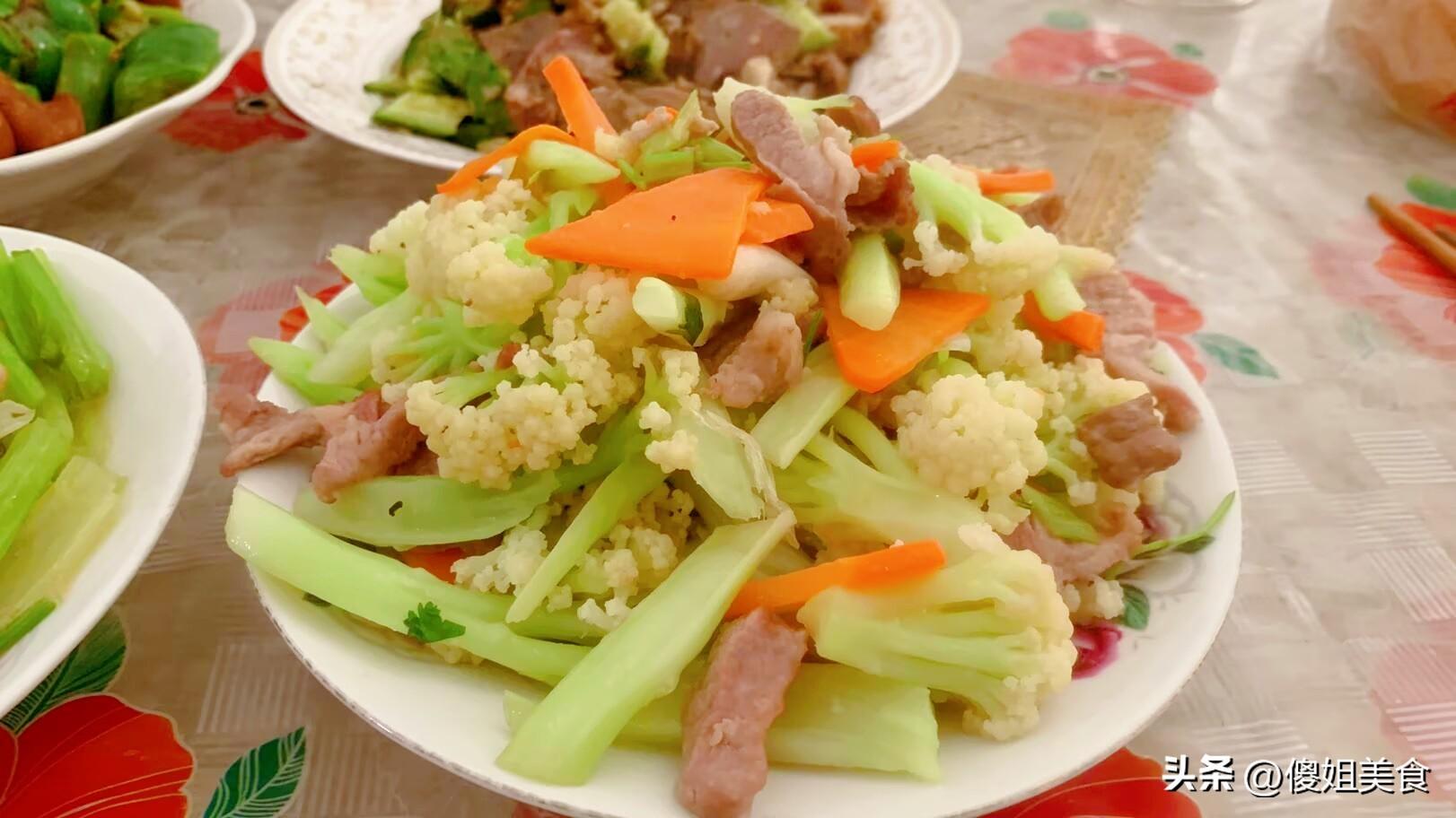 第三個菜是炒花菜。白生生的花菜掰成小朵,配上胡蘿蔔片和提前醃好的肉絲。老媽炒菜有個習慣,先焯水,她說這樣炒出來的花菜脆而不生,更容易入味。