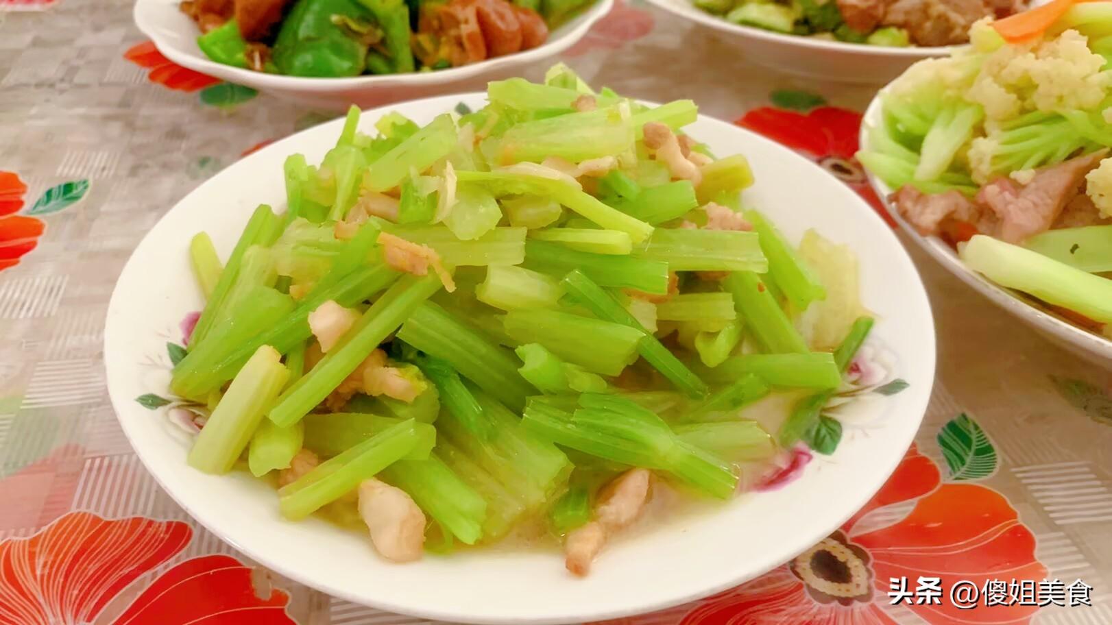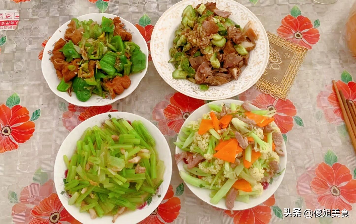 接着是芹菜炒肉。五花肉切條,用料酒生抽醃着。熱鍋冷油,肉絲滑散,蒜末爆香,倒入切段的芹菜,大火快炒。芹菜的清香和肉香混在一起,是記憶裏最踏實的味道。
