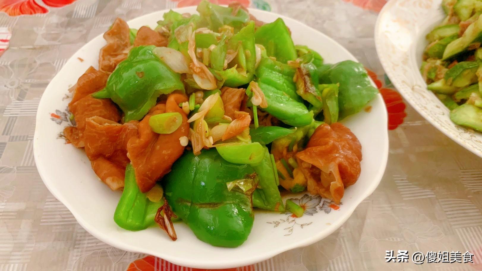 第一個菜辣椒炒大腸。老媽知道我饞這口,特意去熟食店買了滷好的大腸。只見她將肥腸切段,青椒滾刀塊,熱鍋涼油,蔥薑蒜爆香,倒入大腸煸炒出油,再加入青椒快速翻炒。辣味竄出來的時候,我的口水都要流下來了。