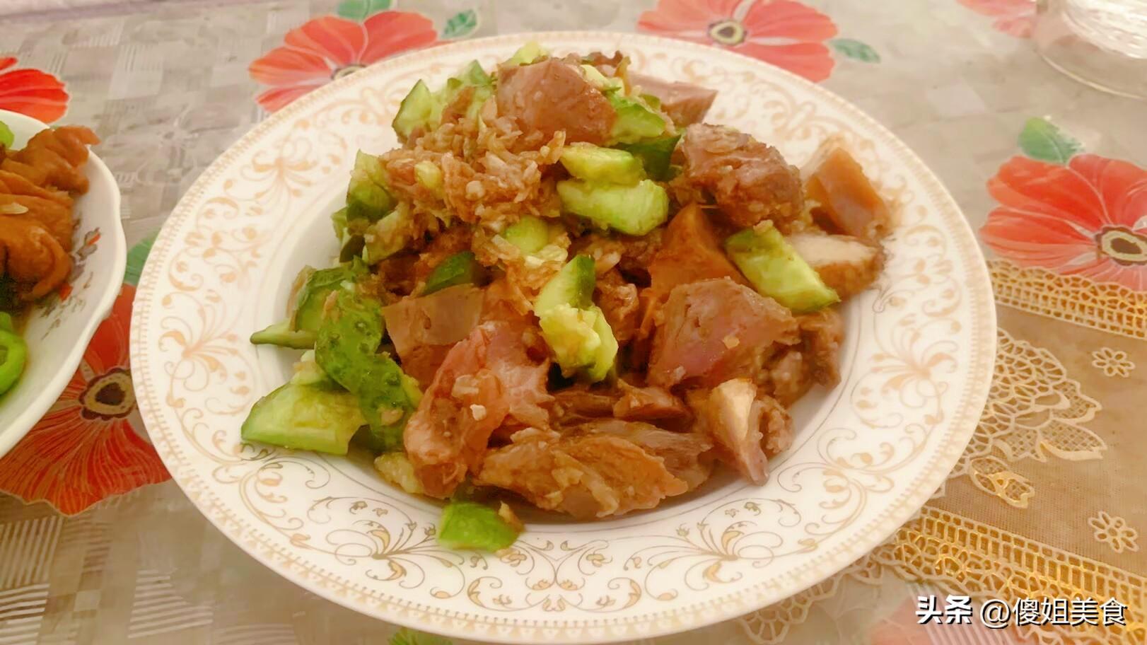 喫包子必須配個涼菜,黃瓜拌燒肉——燒肉切成適口的塊,黃瓜拍松後也切塊,加大蒜末、生抽、醋、少許糖,最後淋上香油。簡單,但清爽解膩,和包子是絕配。