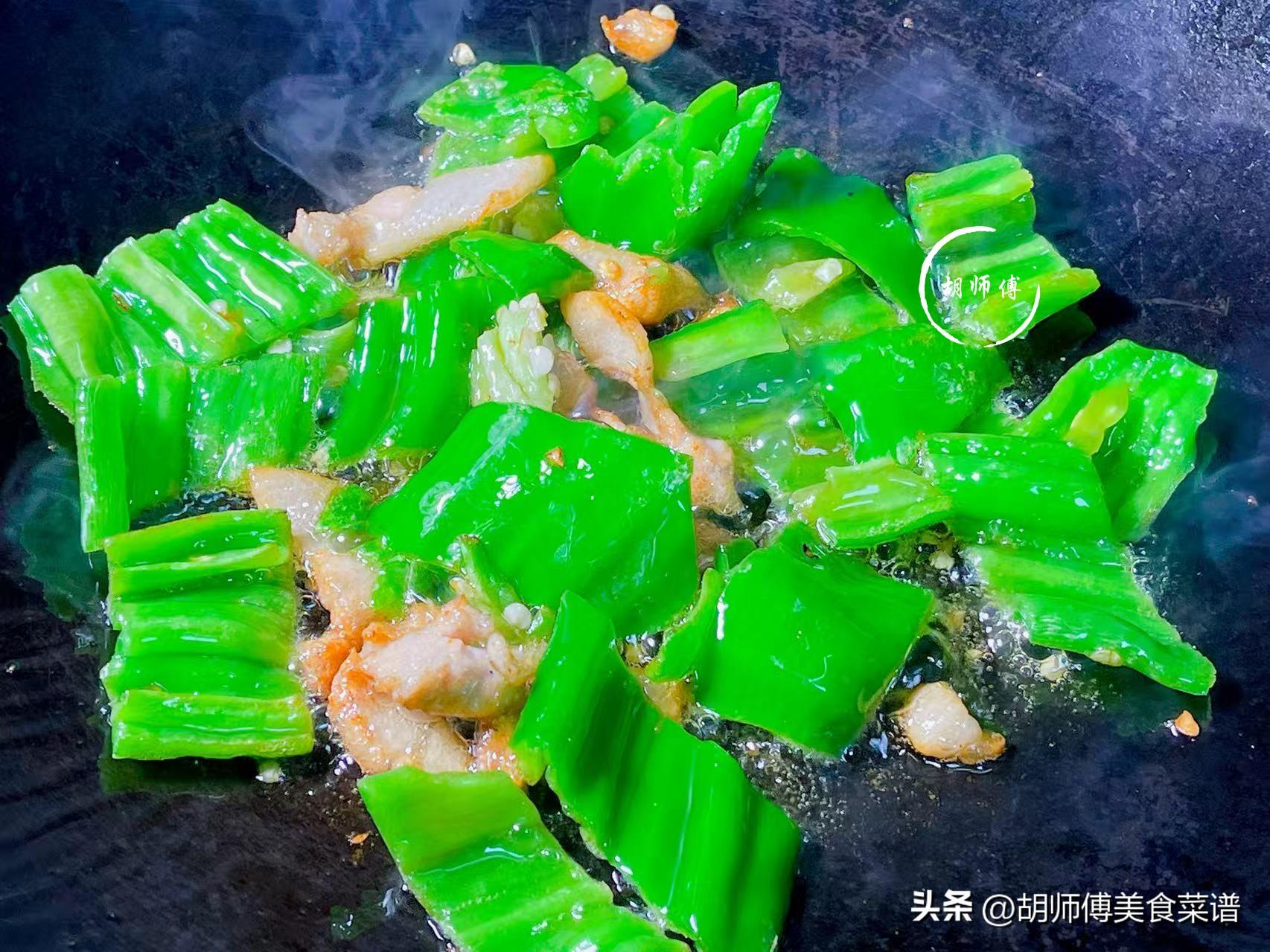 第四步:鍋中放入一點點油,然後將肥肉放入鍋中,中大火將肥肉煸炒成淺黃色,接着再把青椒放入鍋中,繼續大火炒一會兒,將青椒炒的斷生後,撒上一點點鹽,繼續炒七八下即可起鍋。