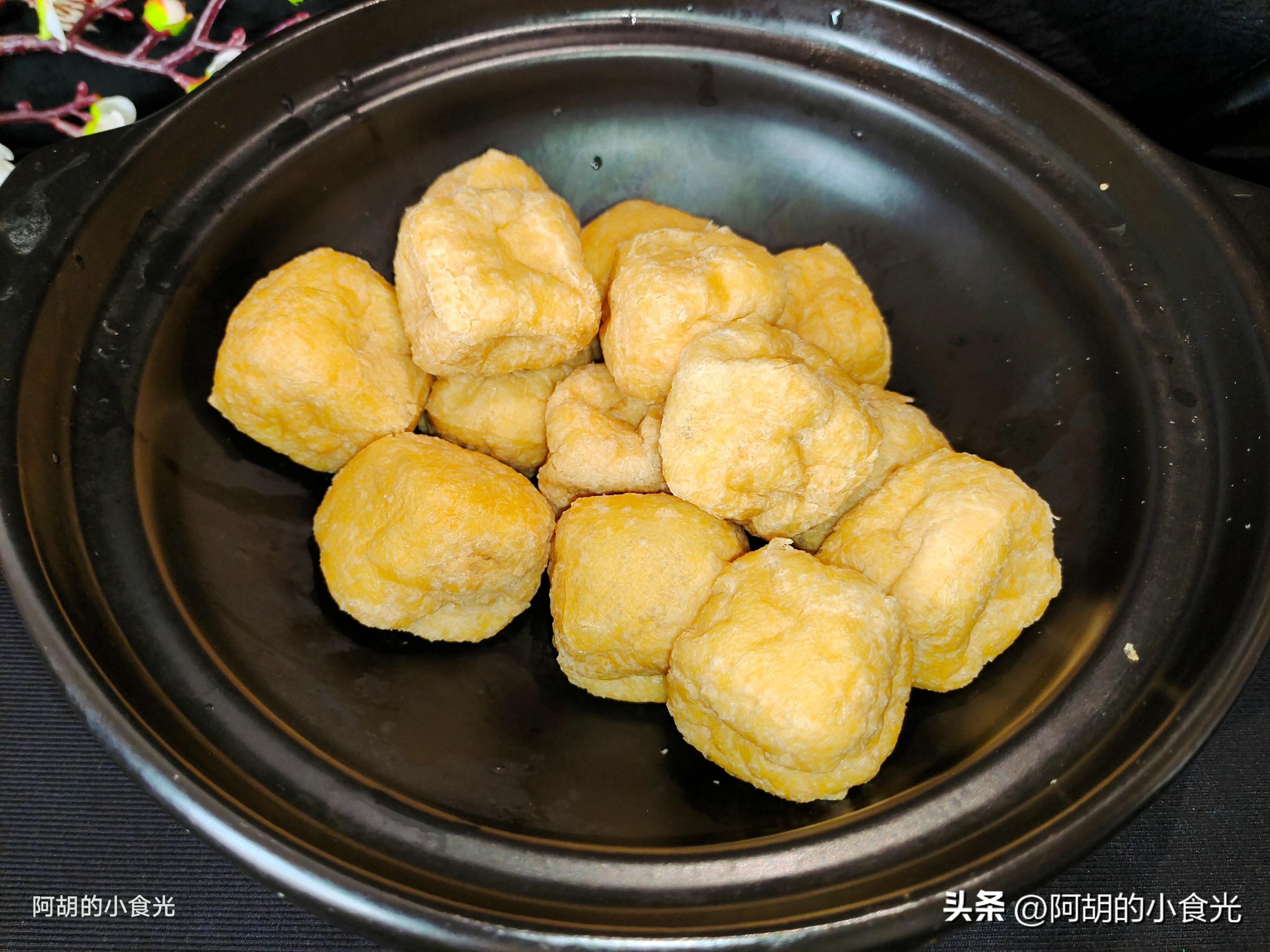 不喜歡油豆腐太油膩的可以進行焯水,不要燙的太久,最多一分鐘時間就撈出,而後用涼水衝一衝讓其快速冷卻下來,還要將多餘的水分擠幹,擠幹後放在一邊不要動,其自己就可以恢復原樣。