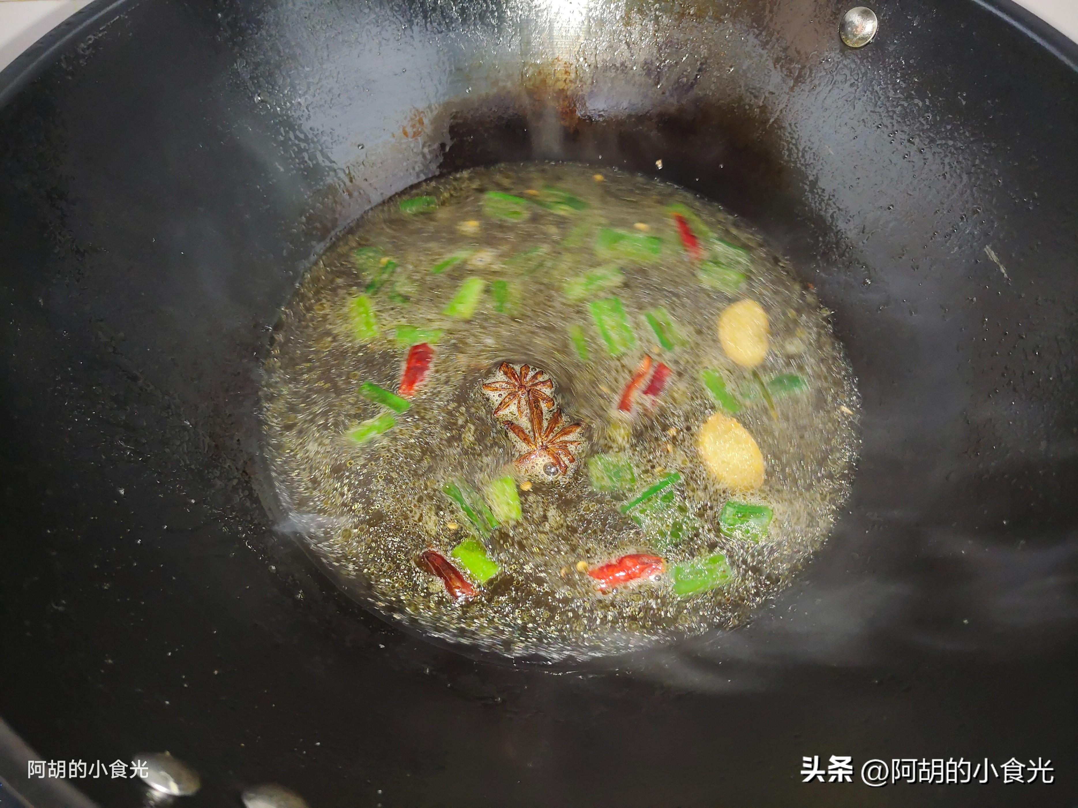 第四步:把鍋烘乾,淋入一些菜籽油小火燒熱,把八角下入鍋中炸出香味,接着再把蔥薑蒜和幹辣椒倒入鍋中爆出香味,再淋入一些生抽熗出香味,接着衝入一些開水,保持大火煮開煮沸。