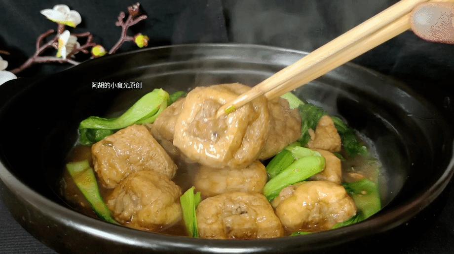 食材很簡單,油豆腐、肉餡、青菜即可,看圖都知道應該是油豆腐釀肉了,其實這菜可以蒸、可以燒湯、更是可以燉菜燒菜,今天這道就是燜燒的做法,濃濃的湯汁被油豆腐吸飽,一口就爆汁,特別過癮又下飯。