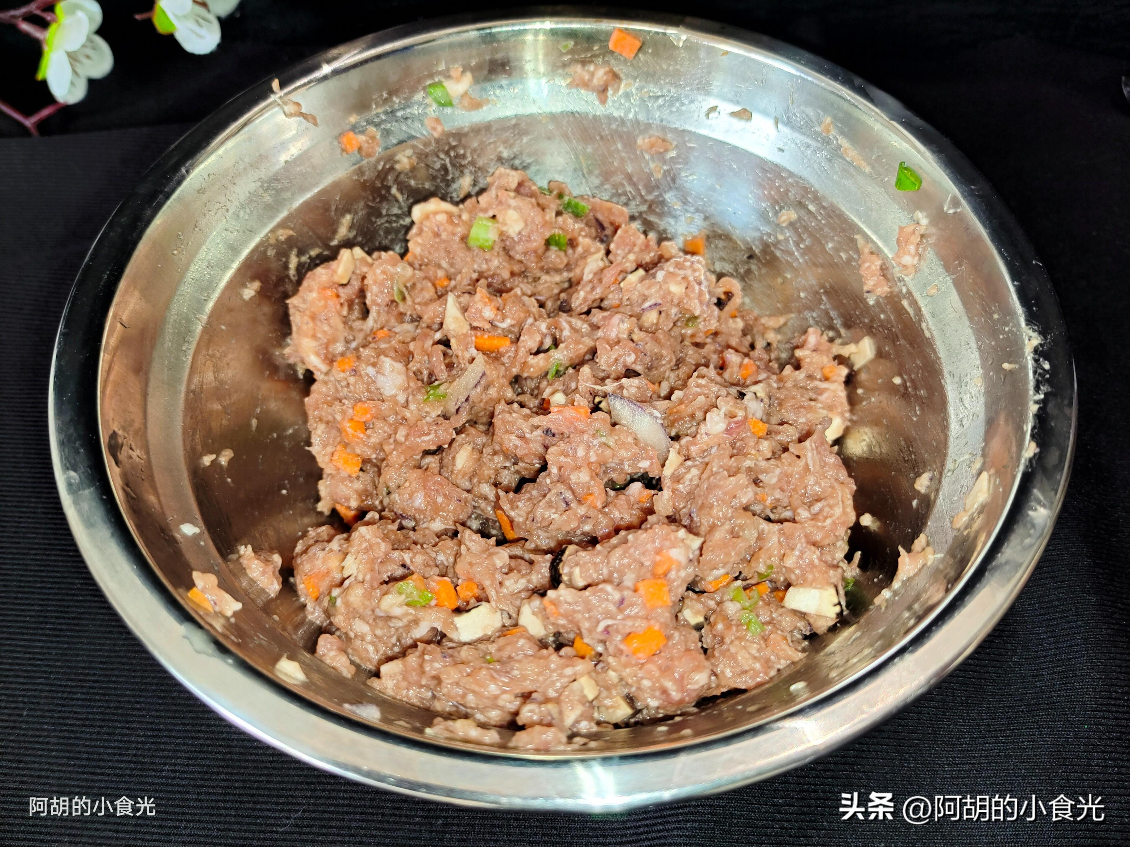 第二步:再來準備肉餡,就一塊有肥有瘦的豬肉去皮切塊放入絞肉機中,加入一小塊洋蔥,一些蔥花,食鹽、雞精、生抽和少許老抽,開機絞打成肉末。而後再加入一些香菇粒和胡蘿蔔粒攪勻,最後來少許的幹澱粉攪拌均勻待用,如肉餡有些幹,則可以少加入一些清水攪勻即可。