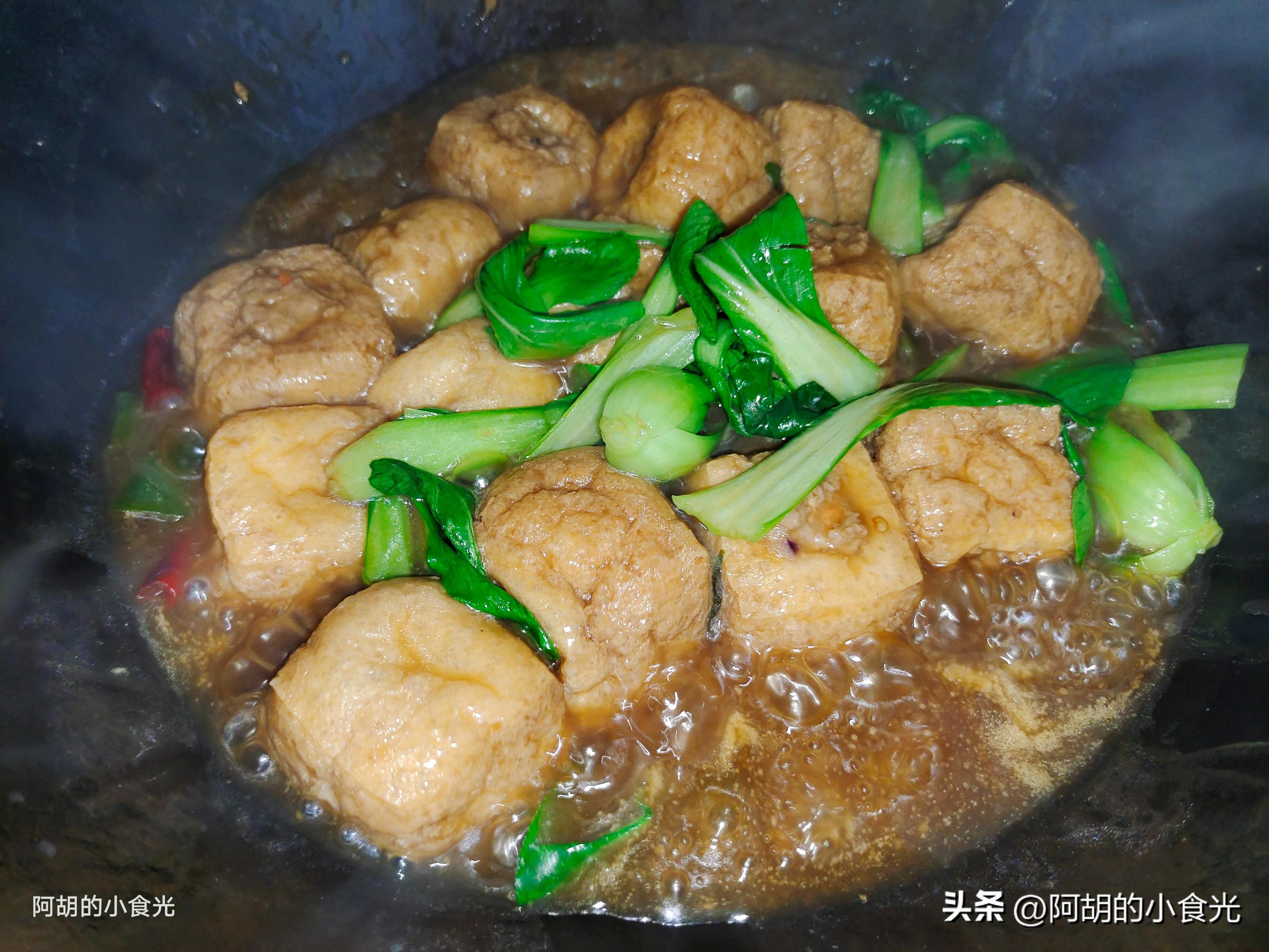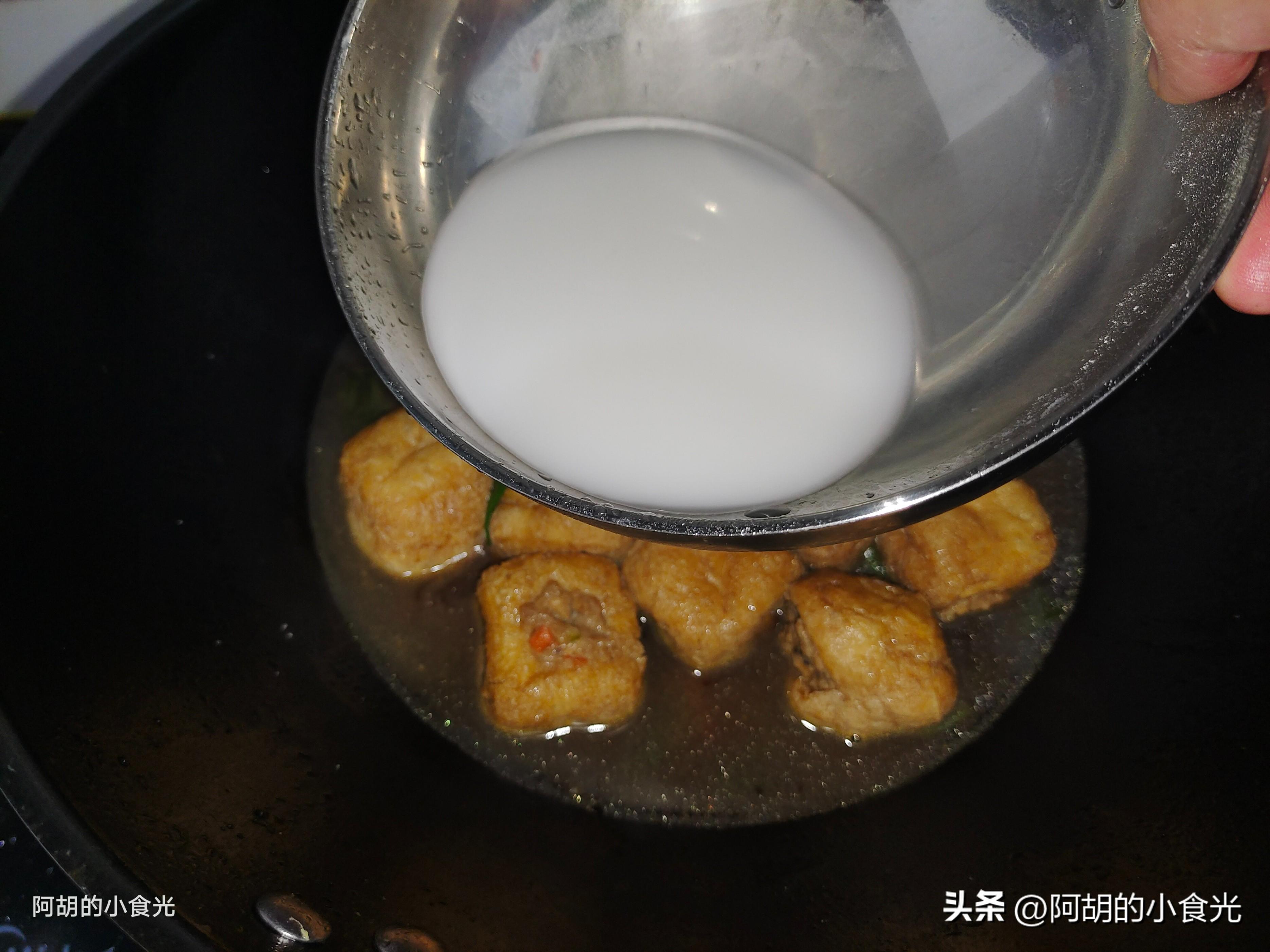 第六步:最後開大火收一收湯汁,再用涼水稀釋一些澱粉水淋入鍋中,讓剩下的湯汁濃稠起來可以掛住油豆腐即可,把青菜葉丟入鍋中,快速地翻炒幾下就可以出鍋裝盤了。軟軟嫩嫩,一口一個,輕輕一咬就是滿口爆汁水,緊接着又是肉香味,開胃又下飯,值得各位試一試的做法。