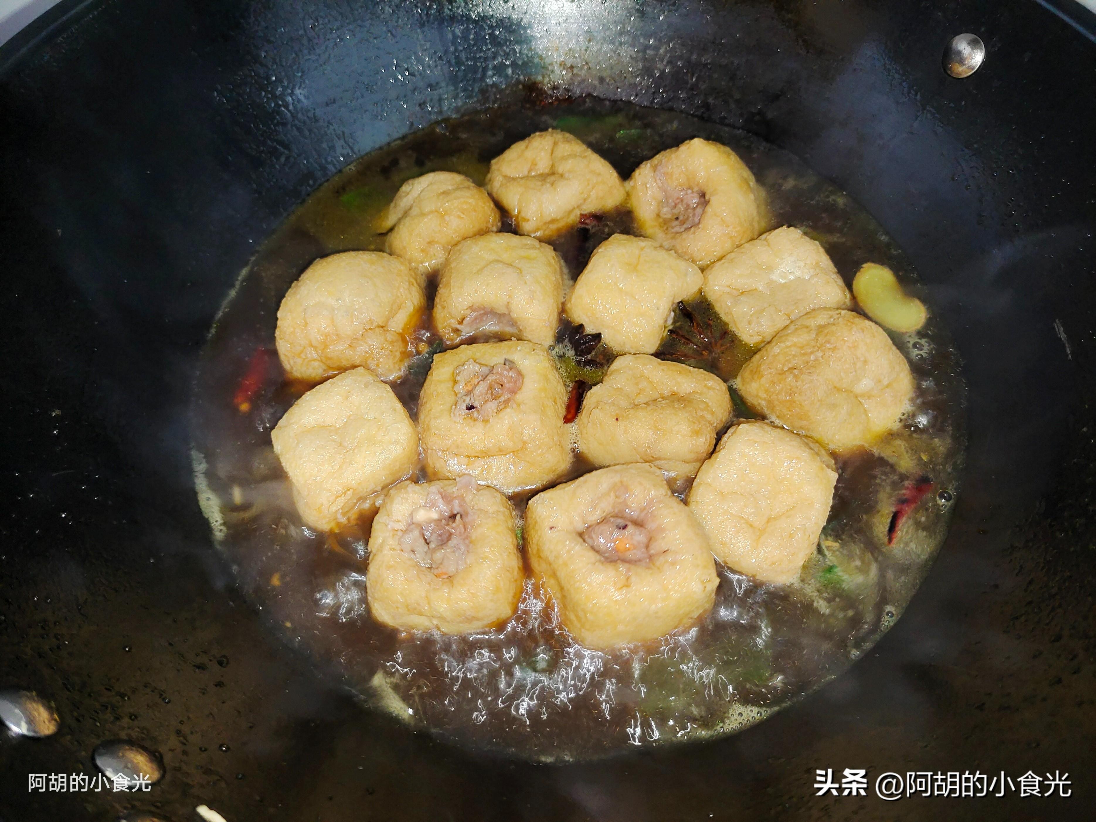 第五步:把釀好肉的油豆腐倒入湯汁中,加入一些食鹽、雞精和白糖調味,感覺顏色不夠的再來一些老抽調整顏色,略微翻拌後加蓋燜煮五分鐘左右,讓油豆腐充分吸飽湯汁的滋味。