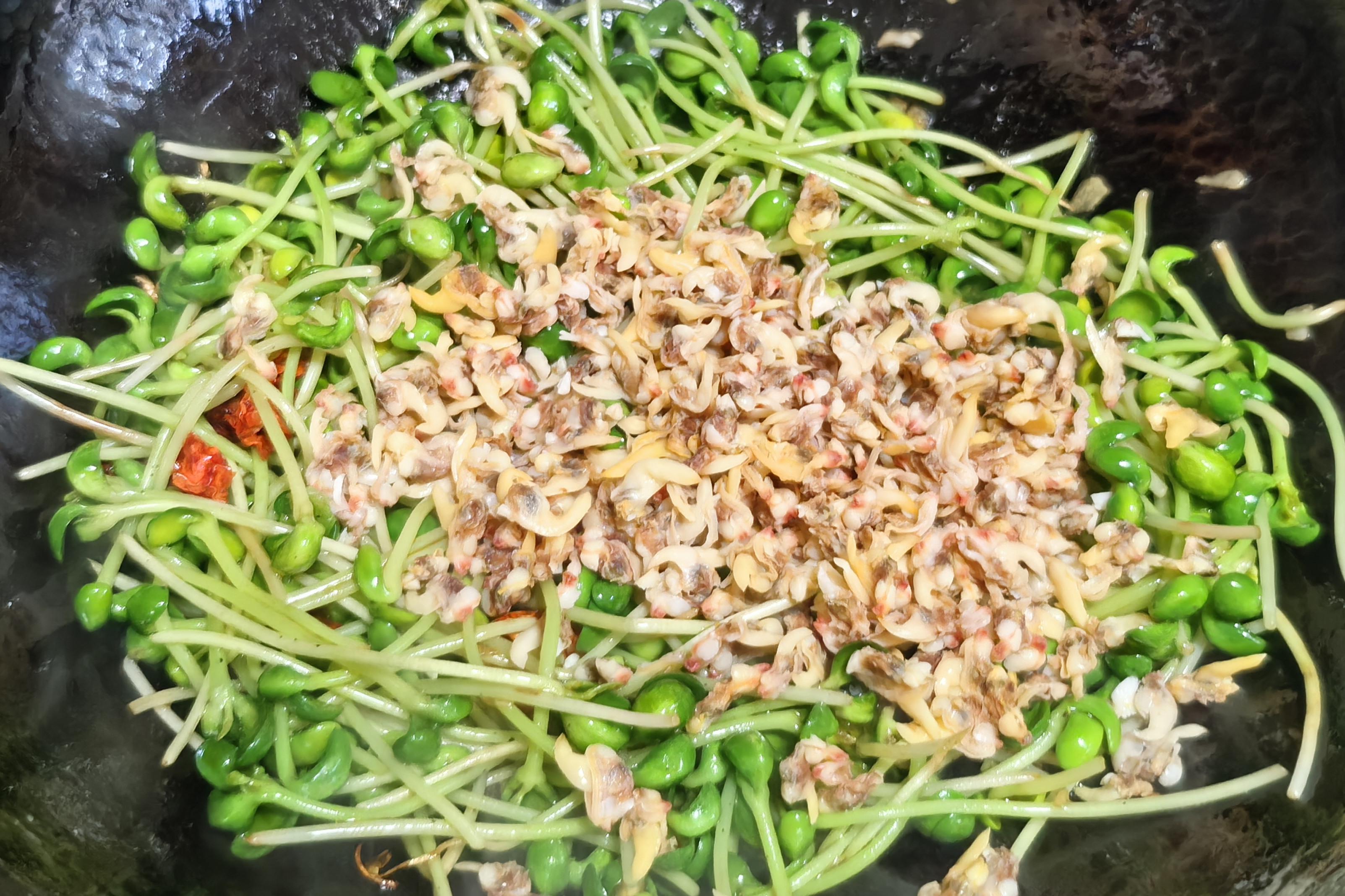 5. 繼續大火快速翻炒均勻,讓醬汁裹滿每一根豆芽和蛤蜊肉。整個過程從豆芽下鍋到出鍋,最好不超過兩分鐘,這樣才能保持極致的脆嫩口感。關火!撒上準備好的綠色蔥花,藉着鍋裏的餘溫再拌一下,香味複合得更完美。好啦,可以出鍋裝盤了!