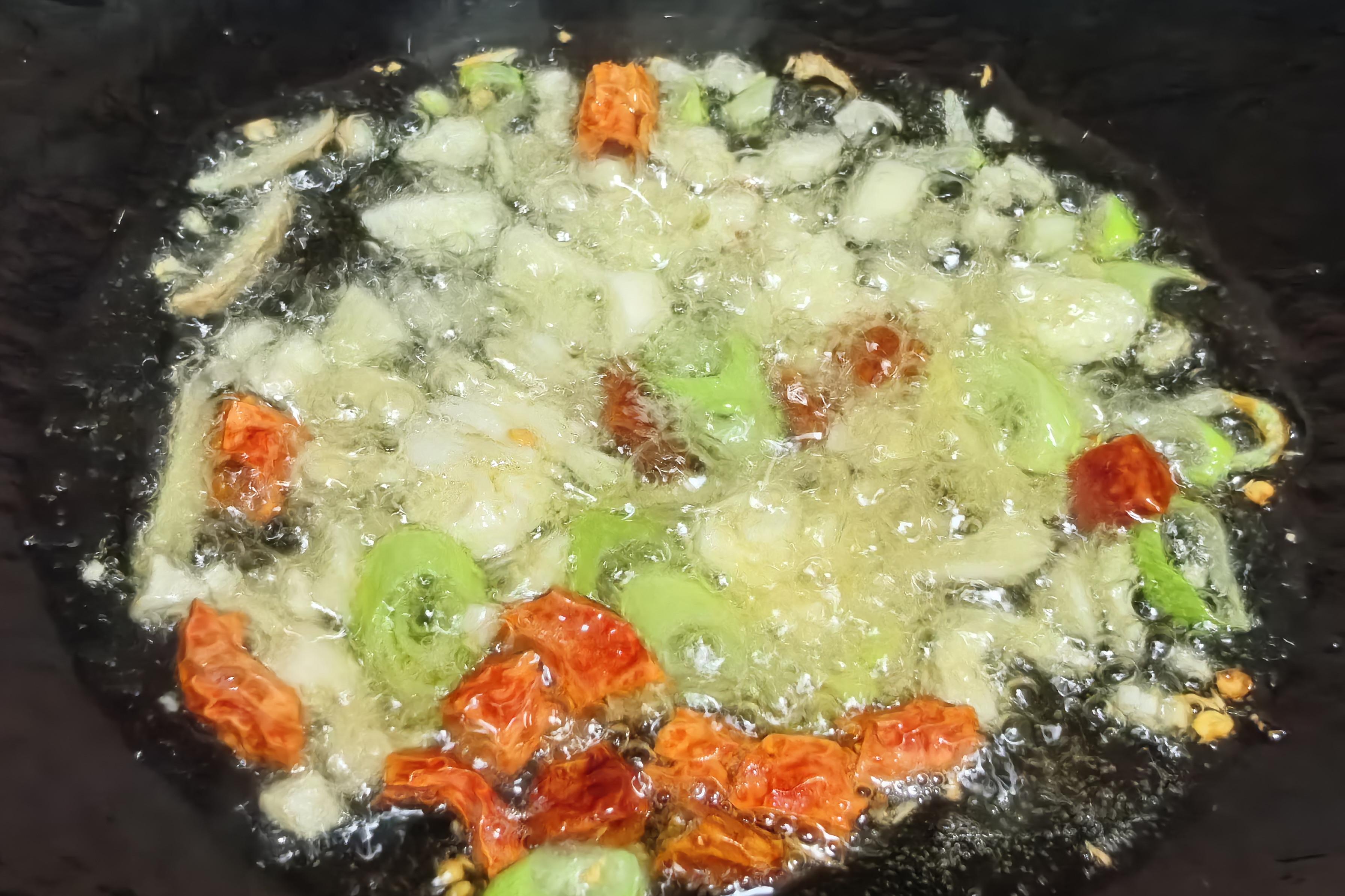 2. 油熱後,轉中小火,先把蒜蓉、小米辣和蔥白碎倒進去。“滋啦”一聲,香味立馬就竄出來了!用鍋鏟快速劃拉十幾秒,把蒜的香氣和辣味都逼到油裏。火別太大,不然蒜蓉容易焦。