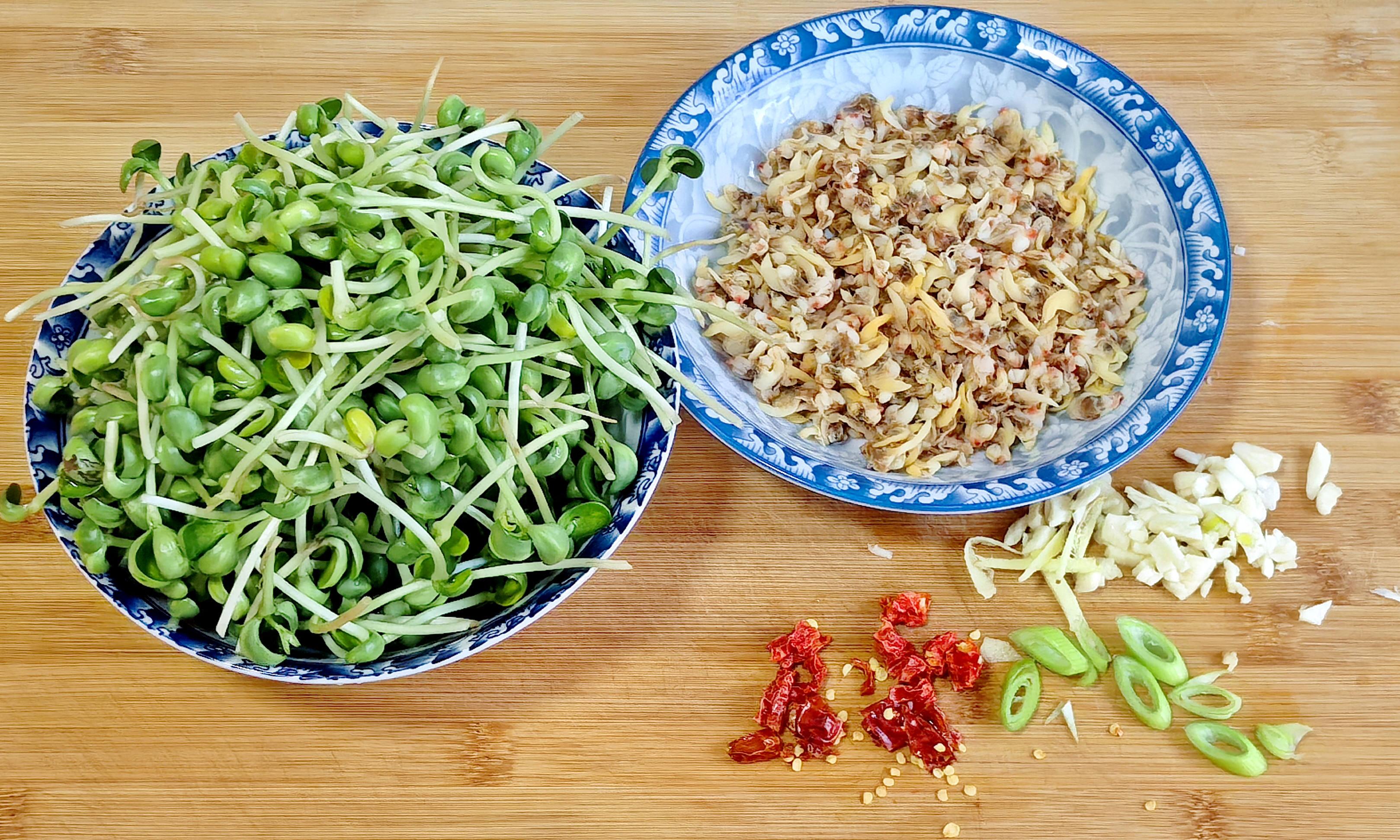 食材準備:黑豆芽 1大盤,新鮮蛤蜊適量蒸熟取肉,大蒜 4-5瓣,小米辣 2個,小香蔥 2根,生抽 1勺半,蠔油 1勺,鹽 少許,白糖 一丁點,食用油 適量