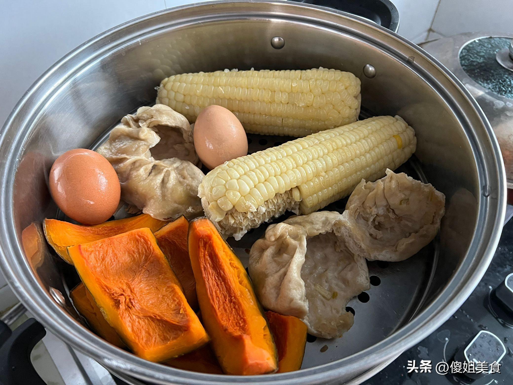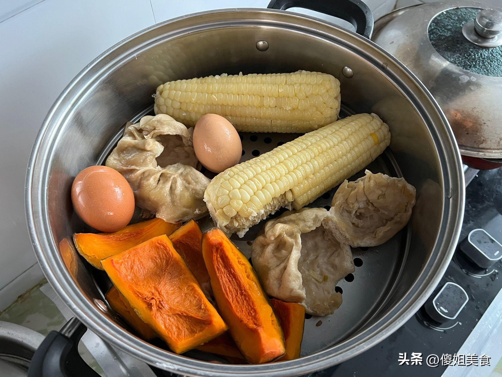 旁邊的玉米是甜玉米,南瓜是切了塊的貝貝南瓜,蒸得軟糯香甜。雞蛋是水煮的,蛋白嫩,蛋黃熟得恰到好處。