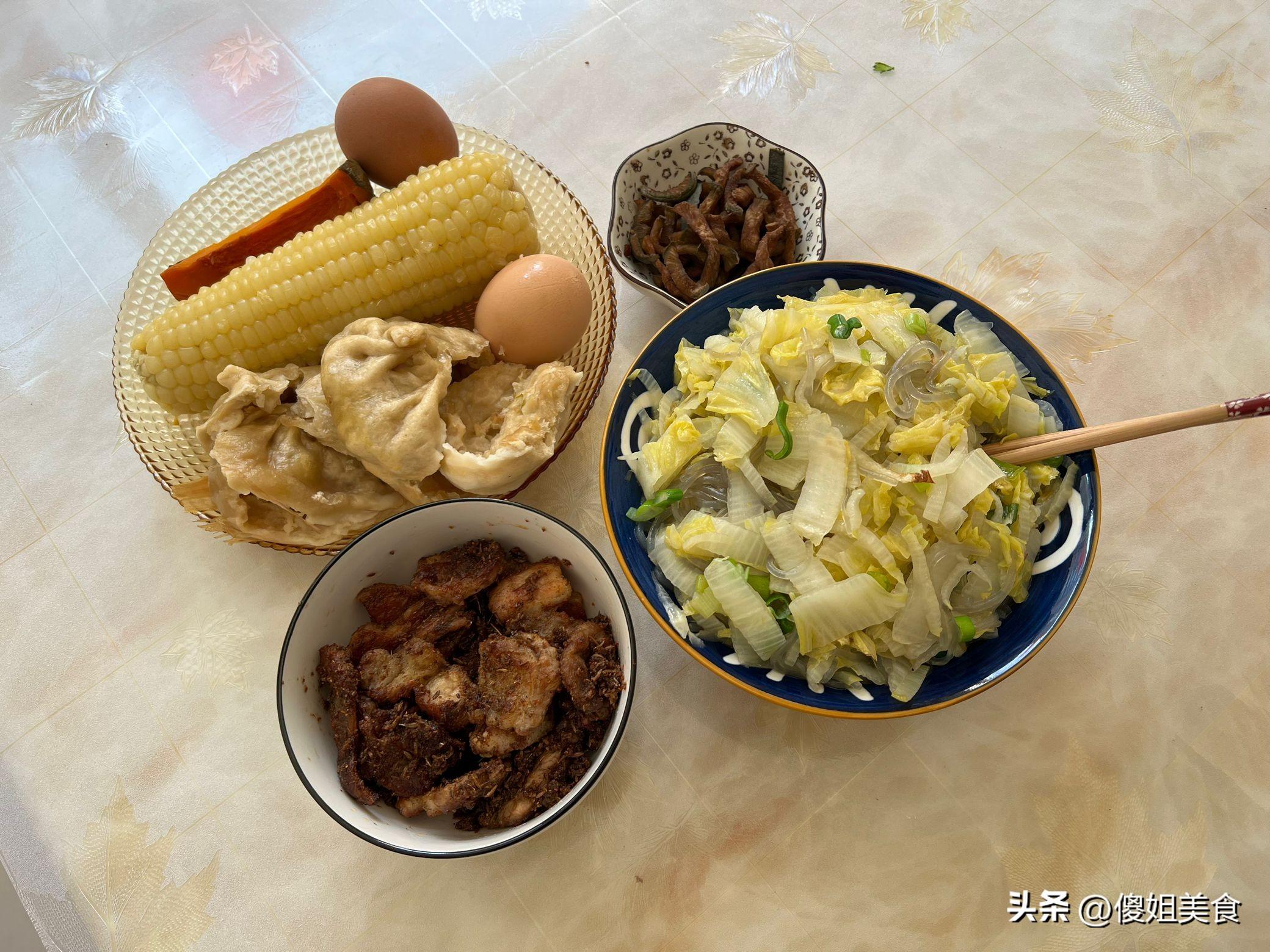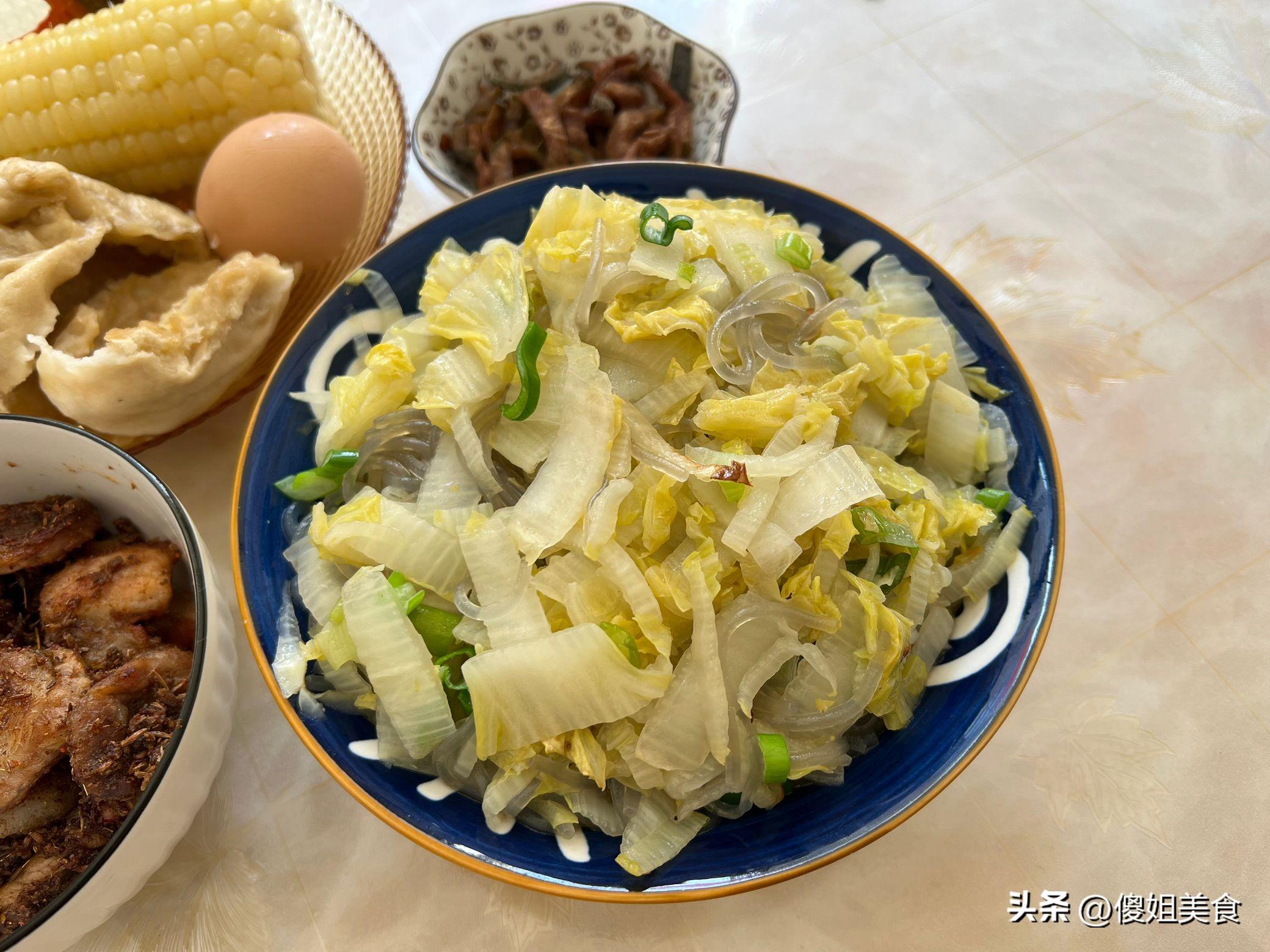大白菜燉粉條,這是北方的家常味道。白菜燉得軟爛,粉條吸飽了湯汁,晶瑩剔透。婆婆說早上喫點熱乎的燉菜,胃裏舒服。