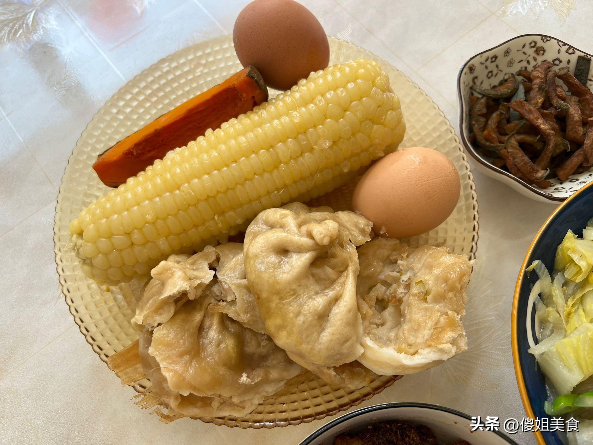 “寒磣”還是“硬實”?評論裏說“賣相寒磣”的朋友,我理解。這桌子早飯,確實沒有精緻的擺盤,沒有漂亮的濾鏡,就是普普通通的家常樣子。玉米沒有切成整齊的小段,南瓜塊大小不一,包子皮形狀也不規整,燉菜裝在大碗裏,炒肉裝在盤子裏——一切都是最自然的狀態。