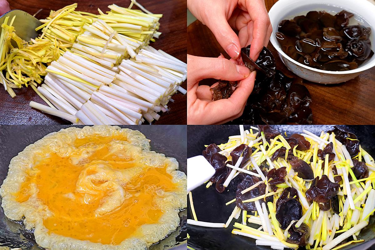 1. 韭黃洗淨切段,黑木耳泡發後焯水切小塊。