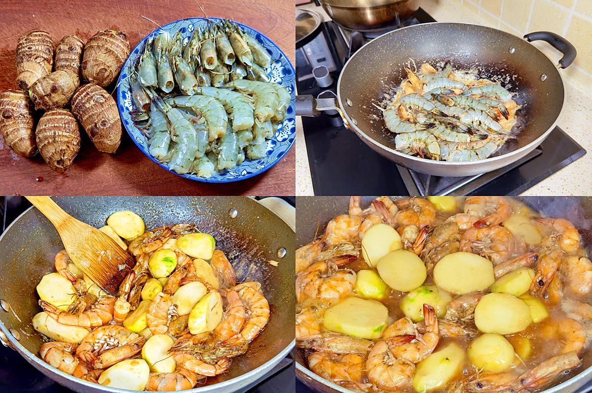 1. 芋頭去皮切滾刀塊,大蝦剪去須腳,準備薑片、蔥段。