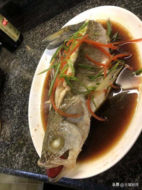 調味裝盤:在鱸魚身上重新放上新鮮的蔥絲和紅椒絲,淋上蒸魚豉油。鍋中倒入食用油,燒至冒煙,然後將熱油均勻地淋在蔥絲和紅椒絲上,激發出香味,一道鮮嫩可口的清蒸鱸魚就完成了。